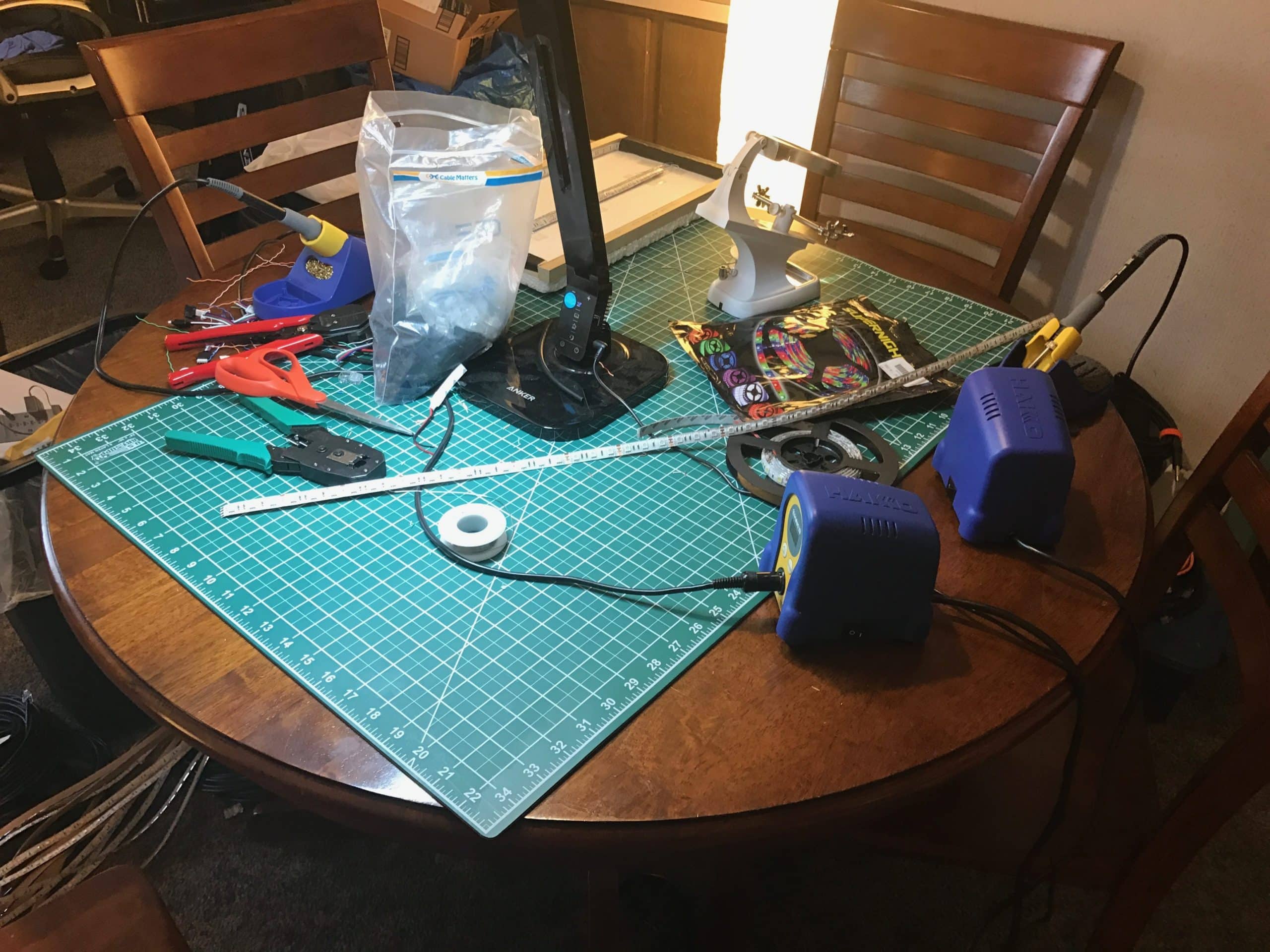 We soldered the LED strips while waiting on the wood to arrive. The one meter length of RGB tape runs along the inside of the frame starting at the top, wrapping around one side, and ending at the bottom. The LEDs are covered on the side that runs up and down so that light only comes from the top and bottom of the frame. The way the wiring ran into the frame allowed us to solder all of the RGB wiring in advance but we decided to wait until the lights were assembled before attacking the white LED strips