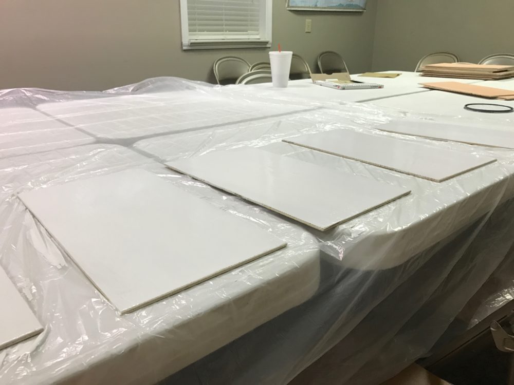 A local high school shop class volunteered to trim the wood to size and help us prepare some of the pieces for assembly. Thank you Statesboro High School and Mr. White! Each light box is built with a Luan back board measuring 17”x9” with a frame made from two 0.5”x0.75”x17” pieces and two 0.5”x0.75”8” pieces. The luan backboard was painted flat white and the frame painted flat black. The 17” pieces had a 10° angle to help direct the RGB light onto the backboard.