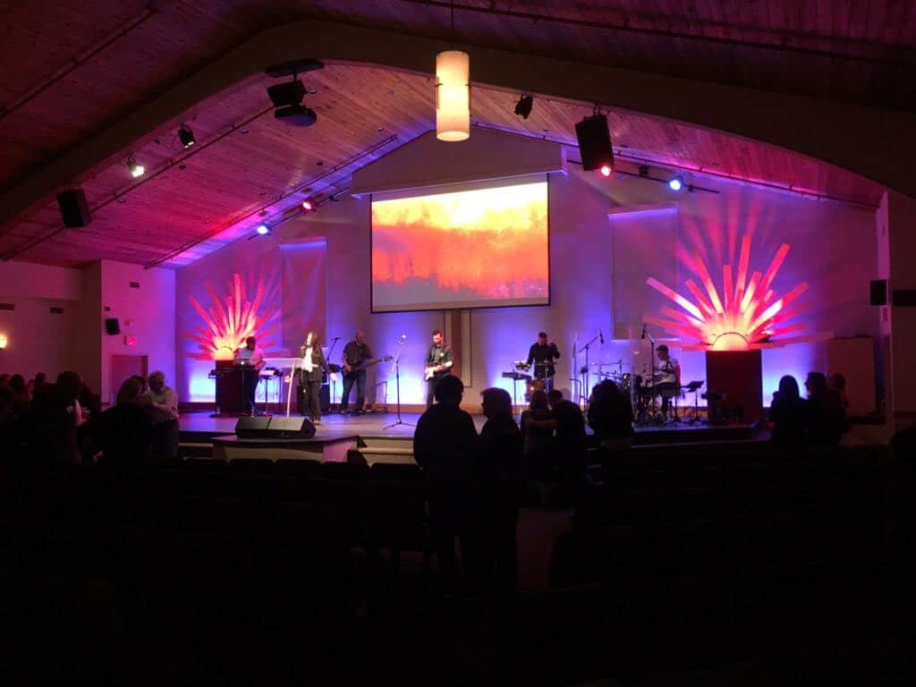 This design was simple, plywood half circles separated about a half inch. Then they put some recycled Coroplast slats (cut at different sizes) from their previous stage design in between. They used two LED par cans on each.