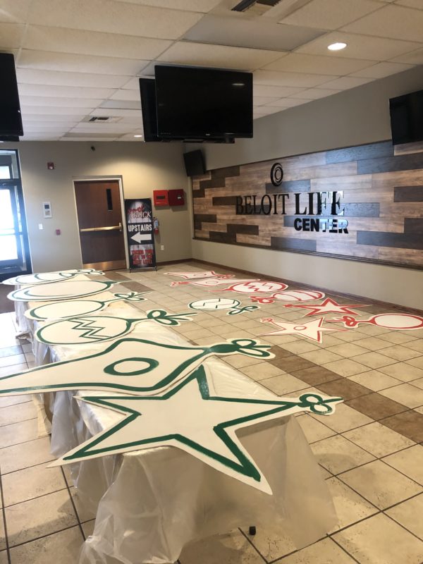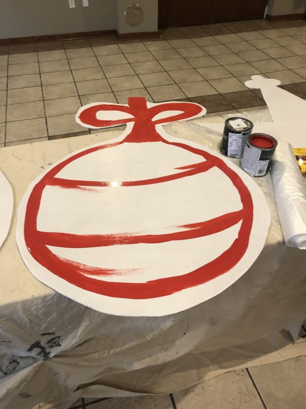 They had the black supports up from their last set so they cut ornament shapes out of 1/8 inch plywood and painted them white, followed by the designs. Then they hung them simply by screwing them into the frames anchored to the wall. Then they hung ribbon to make it look like their ornaments were hanging. Total cost was around $200.