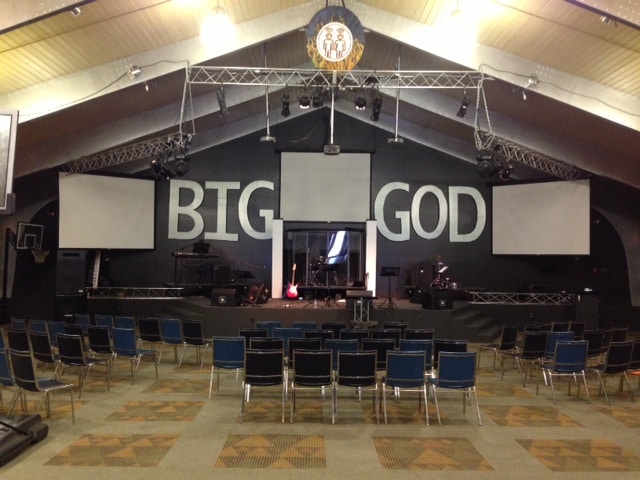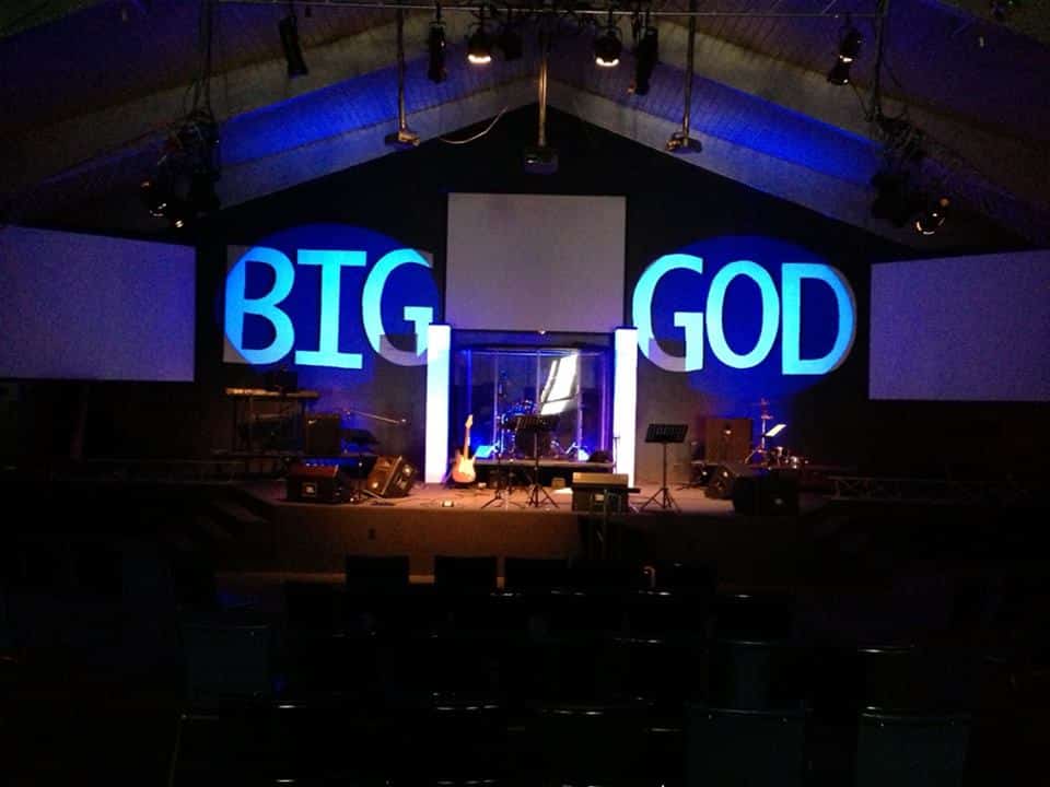 For a sermon series titled “Big God”, they utilized 1/2″ thick insulation foam to create large letters and cut them out. They used a light green colored insulation foam, which reflected light extremely well. Each piece costs approx. $11 at Lowes or Home Depot.