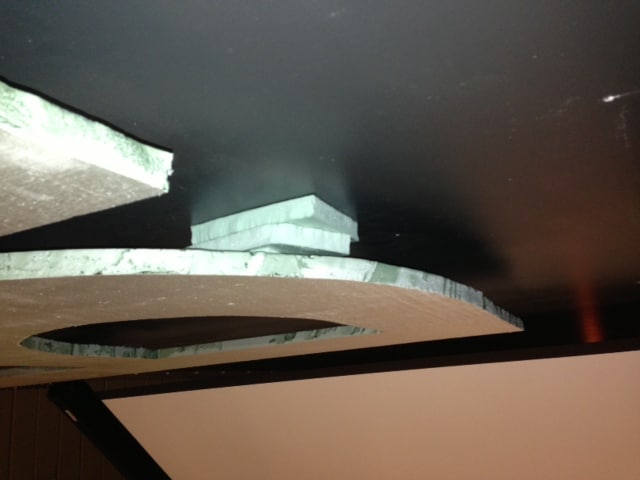 Then they affixed the foam to the wall behind the stage, spacing it from the wall approx 1 1/2 inches. The words were lit using Chauvet Intimidator Spot 350 lights.