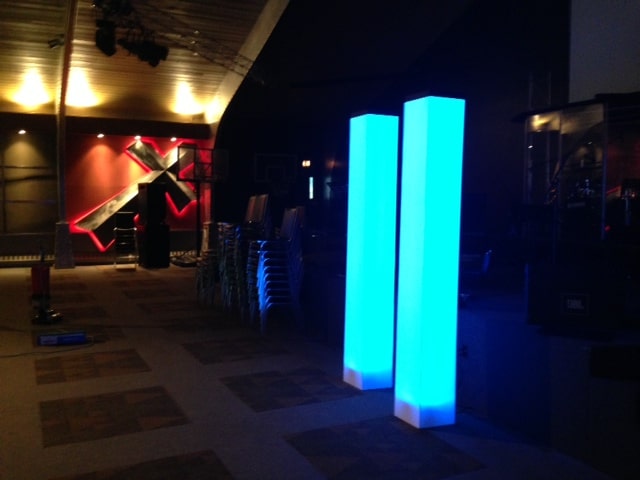 On the top, he placed a cap made of aluminum foil for the inside, and black felt on top of it. The aluminum foil was to help reflect the light better. This was done simply by stapling the foil to the felt and then taping it on the top of the column with clear packing tape. He then used black gaffers tape around the top edge to create a clean line. The columns were lit with Chauvet SlimPar 64 RGBAs, but any similar light will do nicely.