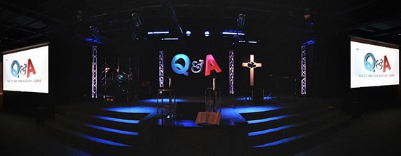 They do an annual “Q&A Service” at the beginning of each year. Last year they decided it needed its own identity that also gave them a week of breathing room after holidays to ensure the follow up stage design could be implemented. Their lead graphic designer came up with a great graphic that branded this service. Instantly they thought of replicating the 3D lettering from the graphic. However, when they investigated the pricing for 3D letters at the size they were looking for (5ft or larger), it became cost prohibitive. So they looked into printing large 2D letters that maintained the shading and appearance of the 3D design.
