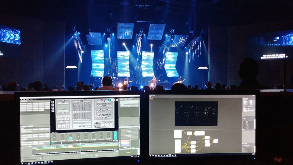 Lighting control was handled using Lightforge. All pixel control was handled through a custom piece of software that allowed for pixel mapped video as well as procedural effects taking into account the X Y and Z positions of each pixel. Projection mapping was handled through a separate piece of custom software that allows for dynamic mapping of multiple outputs of pre-rendered content onto whatever surfaces we need. Both of these pieces of software were controlled from Lightforge via Artnet, Midi Show Control, and Midi Timecode. This all can obviously be accomplished a variety of ways but that is what we decided would work best for us in our implementation.