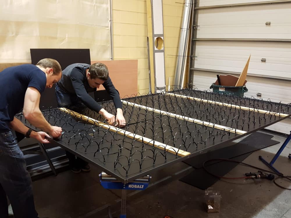 I’ll talk through our LED panels first as they were probably the most time consuming part of this build. We wound up creating 10 individual 6’x9.5′ panels using WS2811 LED pixel nodes. The nodes come in strings spaced 6″ apart and for our panels we created a 4.5″ grid of pixels. Each panel contains 400 pixels (200′ of pixel nodes) and is broken up into 4 50′ long sections for attaching to the controller. We used four HolidayCoro 16 output controllers with two 350 watt 12v power supplies per controller to drive all of the panels. The pixels were punched through holes drilled in black coroplast. The coroplast was then attached to welded metal frames with wood supports on the back side to minimize sagging.