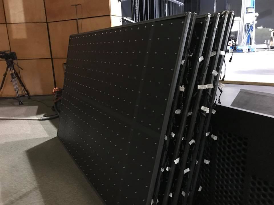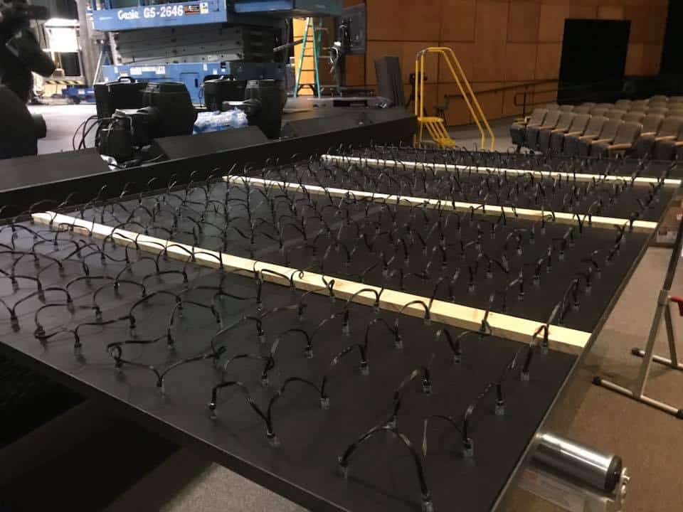In addition to the LED panels we rigged some higher density LED strips off each truss. Each truss got 8 of these vertical strips at 8.5″ long each. These strips are APA102 strips and were driven by PixelPushers. This is a system we already had in our inventory, and as a point of comparison, in our opinion the HolidayCoro controllers are quite a bit superior to the PixelPushers. We will likely be swapping these out in the future.