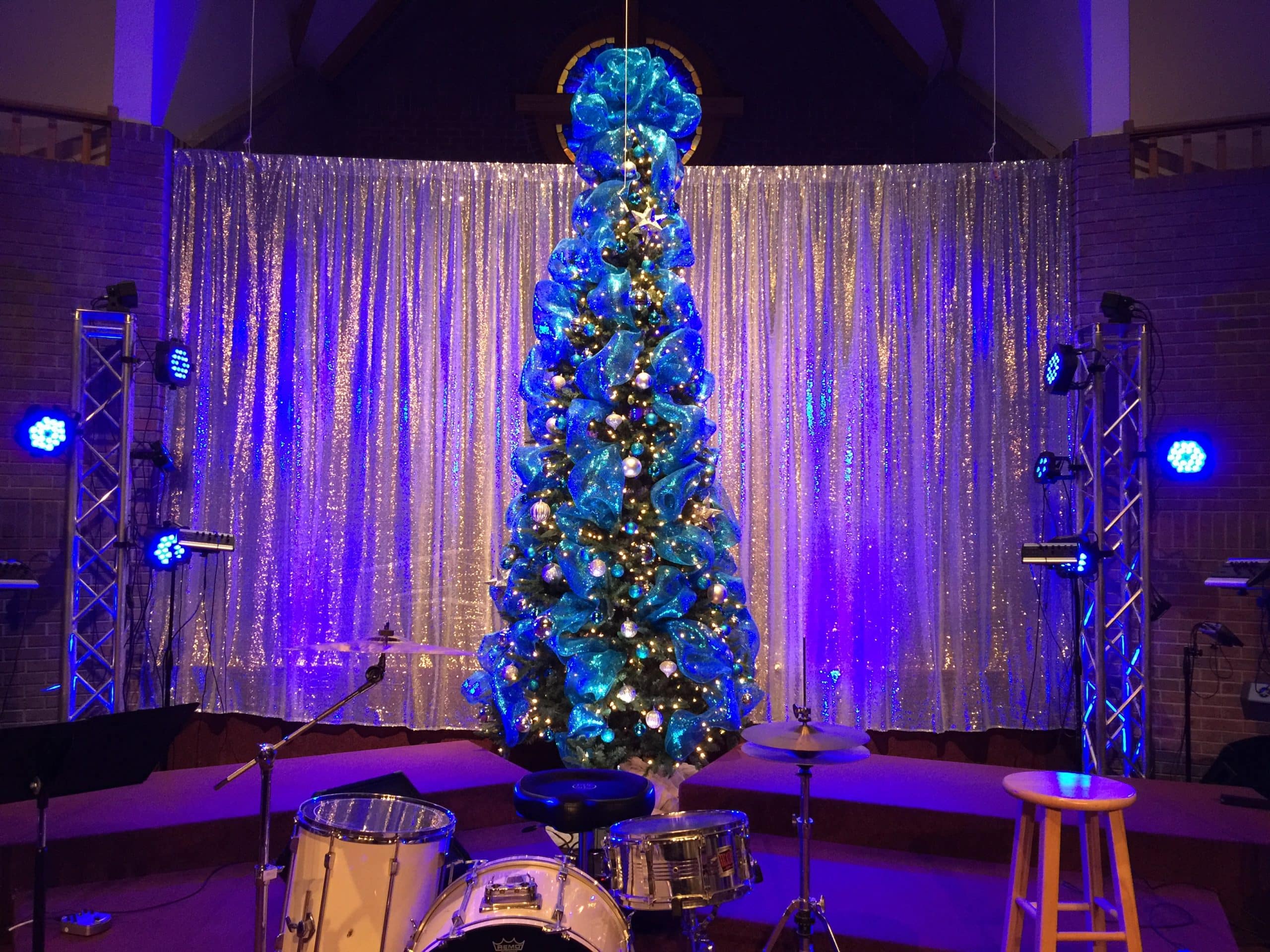 Their Christmas theme was Christmas Presence. Brock wanted a look that would play off of the word, so they decided to wrap lots of empty boxes and fill the stage with them. He also knew that he wanted a pop in the center, so they used a 12′ tree that they already owned and, to make it grand, they used blue deco mesh bought at Hobby Lobby. Behind the tree Brock wanted a curtain, but they had a very small budget. So he found three table cloths that were silver sequins and had one of the ladies from the church sew a pocket along the top. The table cloths were from www.balsacircle.com. He paid $124 for all three.