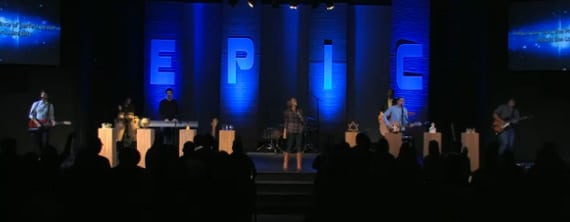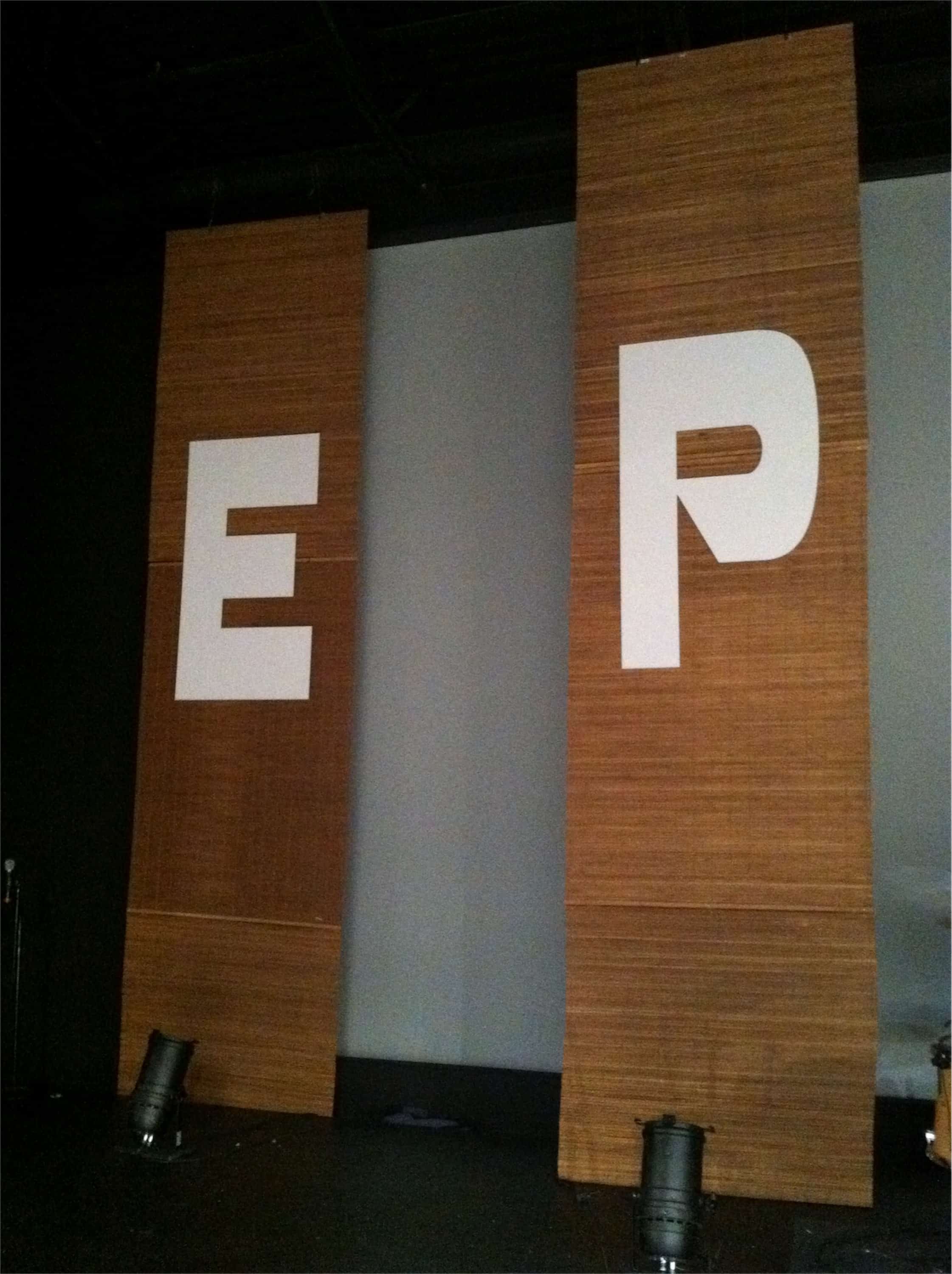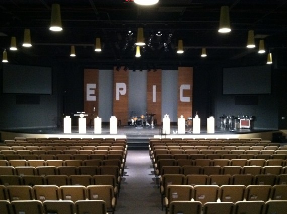 For their 7-week series, EPIC, their pastor requested a visual timeline on the stage. So they built columns on the front of the stage. The columns consisted of two wooden crates ($8/each) from A.C. Moore stapled to each other, then wrapped with blinds (8 total).