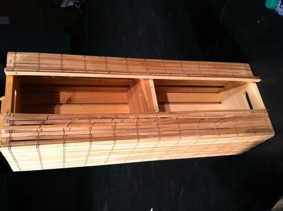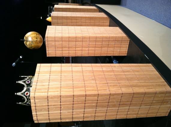 The hanging blinds were 3 blinds per column, tied together and hung from the ceiling with hanging wire. They bought the blinds from Lowes for around $28/each (12 total).