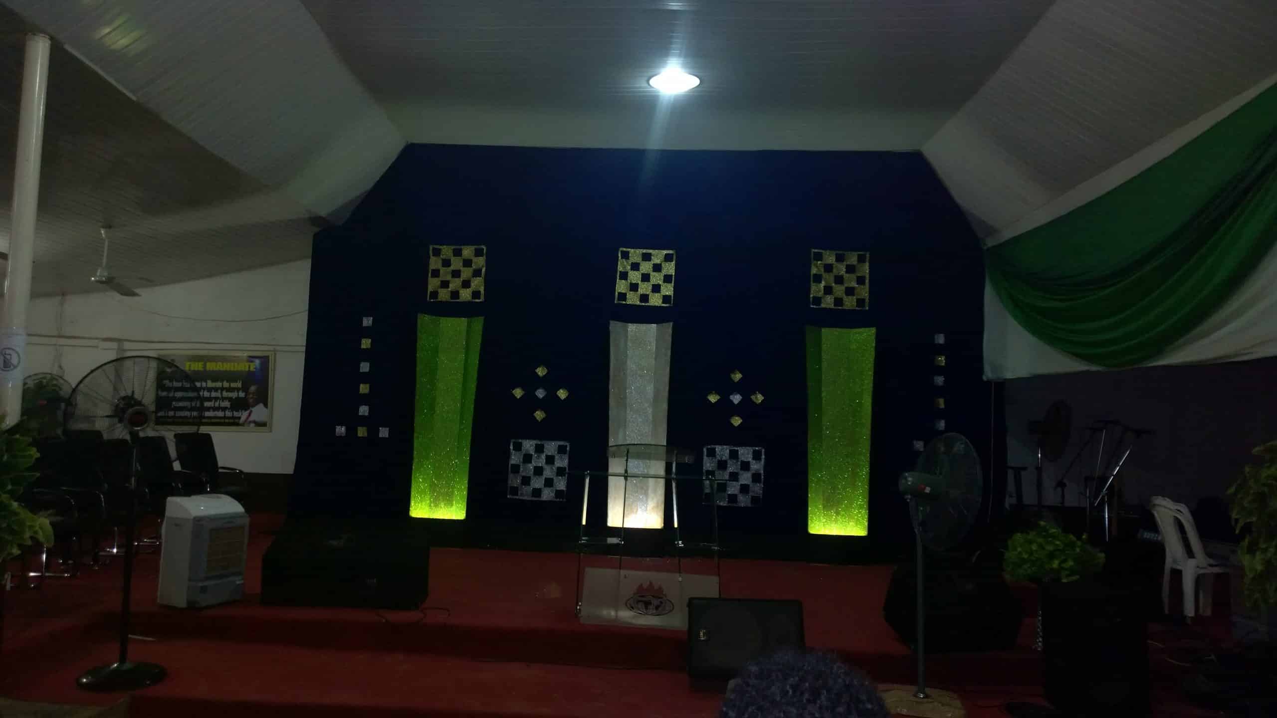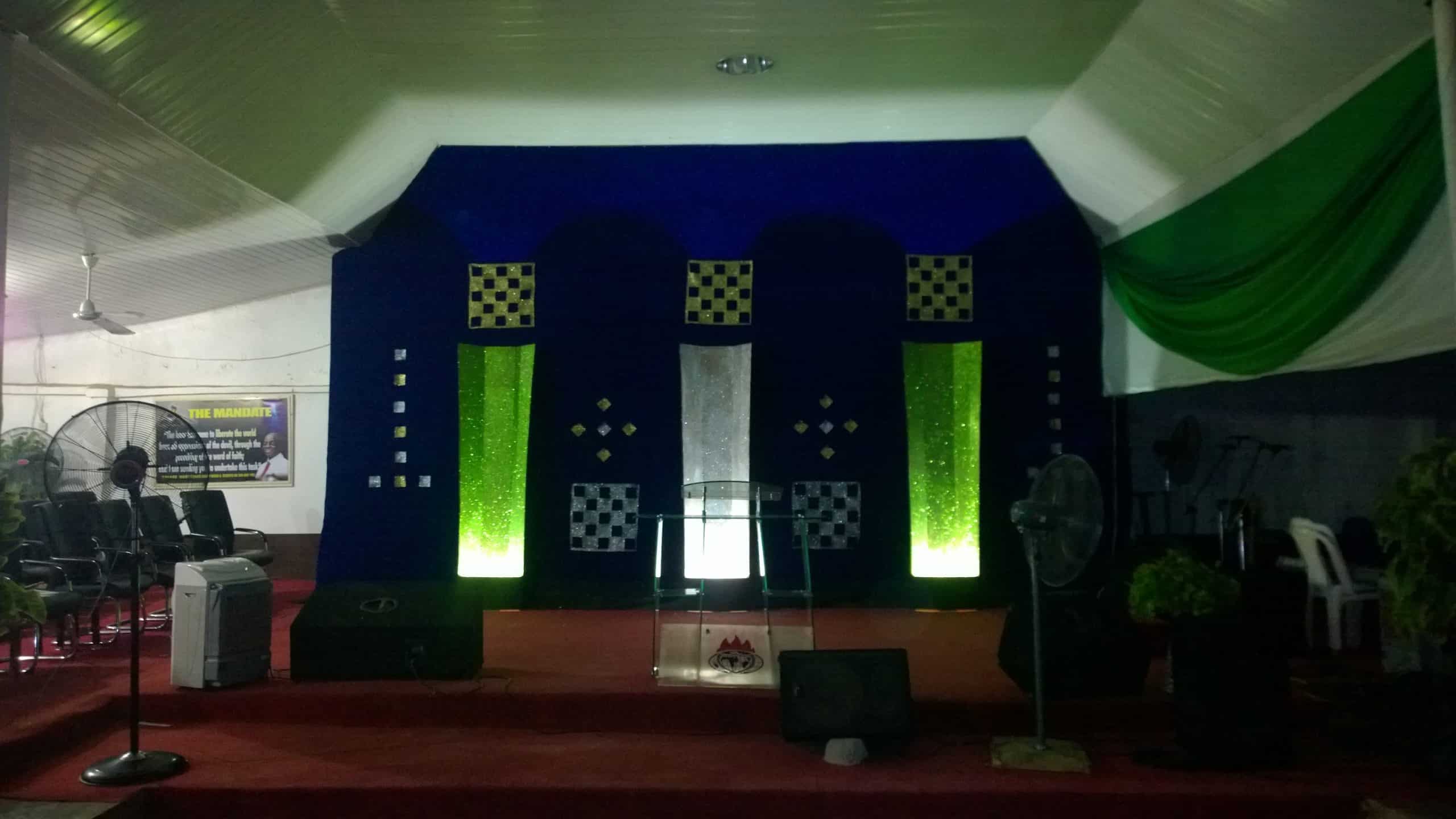 Added Omogbale from Living Faith Church in Edo State, Nigeria, Benin City brings us this glittery stage design. They did this with plywood, glitter, glittery fabric, and some lights.