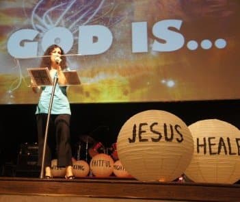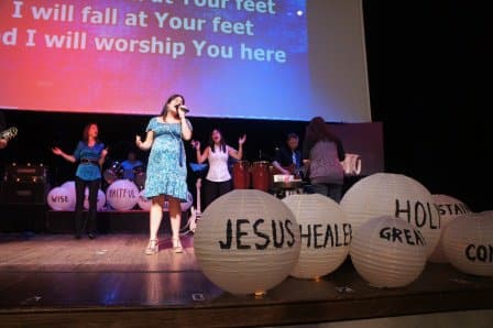 For their Easter series titled “God Is”, they needed a simple, low-cost stage design that communicated the message. So they bought about 30 Japanese paper lanterns varying in size from 30″ diameter to 12″ diameter that they painted with acrylic paint from a craft store. Each lantern was filled with 2-3 flameless LED candles (either placed in the bottom of the lantern or suspended from the top with pieces of Easter basket grass and scotch tape). The lanterns were scattered throughout the stage, on top of speakers, and by the worship team’s equipment.
