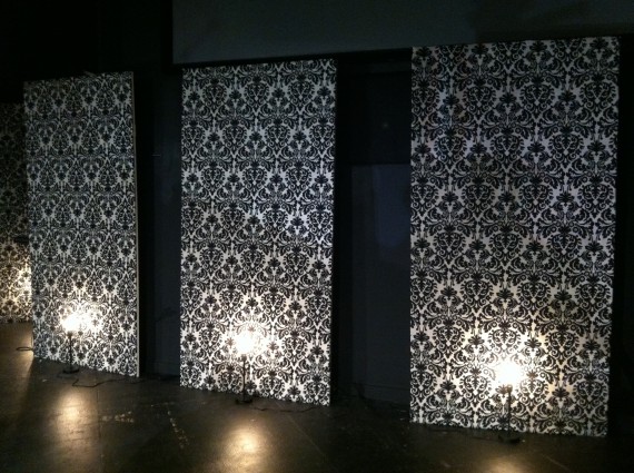 I have been looking at this for weeks, trying to come up with something for my church home. I want to try something like this. Love this so much, our walls are not black, but a soft grayish white color. I thought about instead of fabric, painting the boards a monochromatic gradient color and stenciling the Damask pattern over all in a golden color. Thanks for the inspiration!!