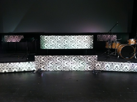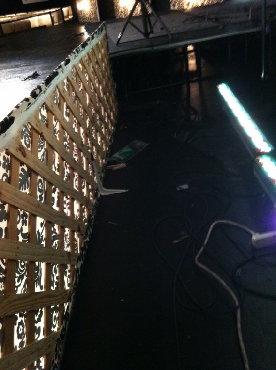 Since their main stage was going to be used very diversely during this series, Adam needed something very light and easy to move. The 4′ x 8′ lattice frames seemed to be the best thing (Home Depot). He bought the fabric from a local “discount” store and simply stapled it around the lattice.