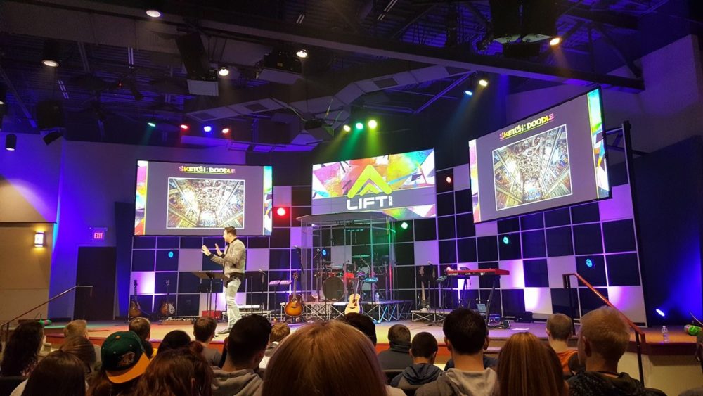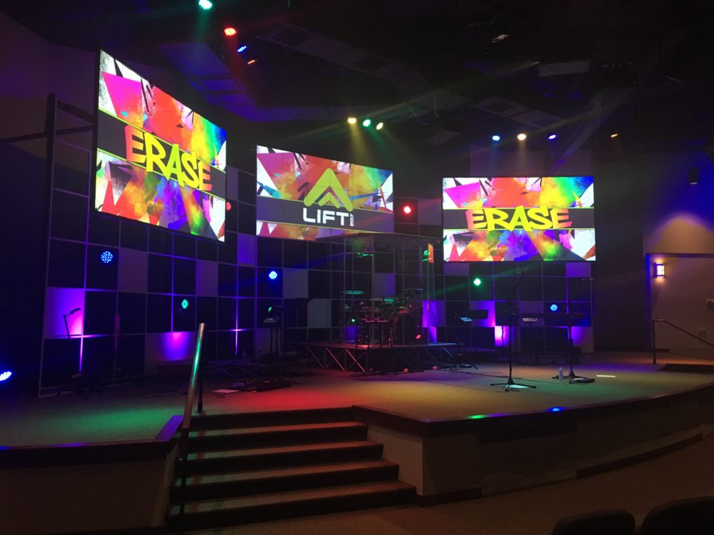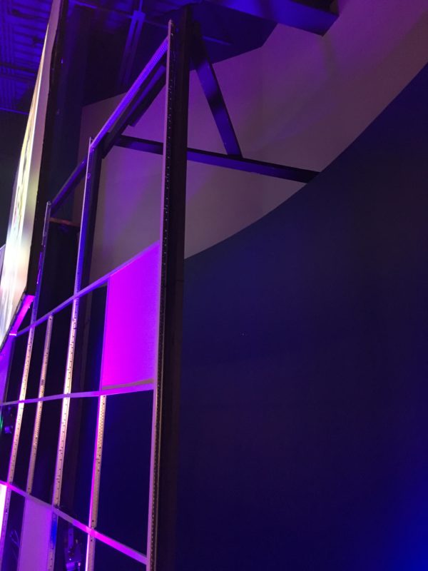 From Mark: This stage build was for our in-house youth retreat for our Jr. High & High School students called LIFT 2017. I got this design idea while looking through various stage designs from tours and conference on Pintrest – and liked the grid pattern I saw.