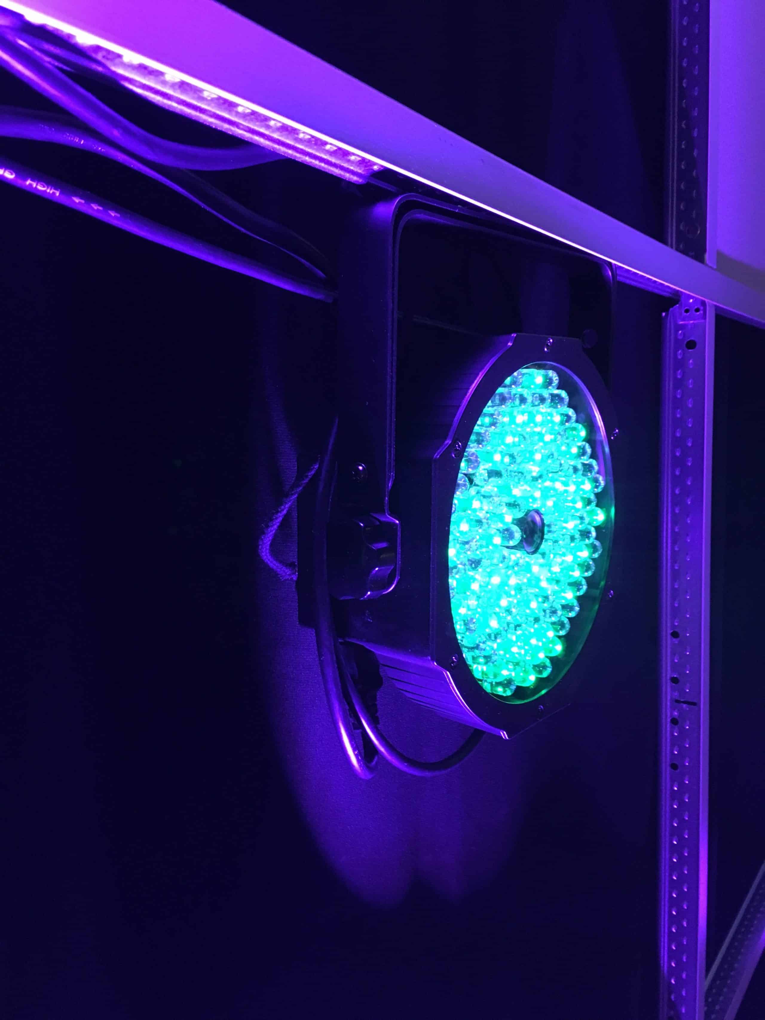 Once the main grid was assembled we then randomly placed 2’x2′ ceiling tiles into holes to fill in the look. We used American DJ Mega Par lights tied to the ceiling grid to do grid lighting, while using 6 – Elation Design LED 36 Tri-Bricks to light the grid structure itself. Hazing was provided by an American DJ Haze Generator (a great, affordable alternative to a DF-50).