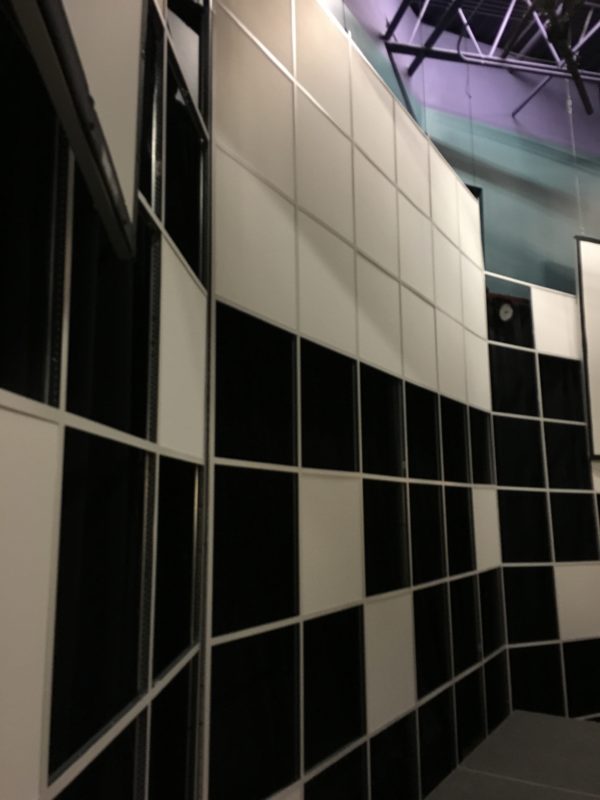 Since we didn’t have a 3rd screen, we modified the standard 12′ high Main Tees of the ceiling grid to go up an additional 4 feet, allowing us to make a “screen” by putting ceiling tiles into the top grids of the structure, and still keeping the drum kit on risers below it.