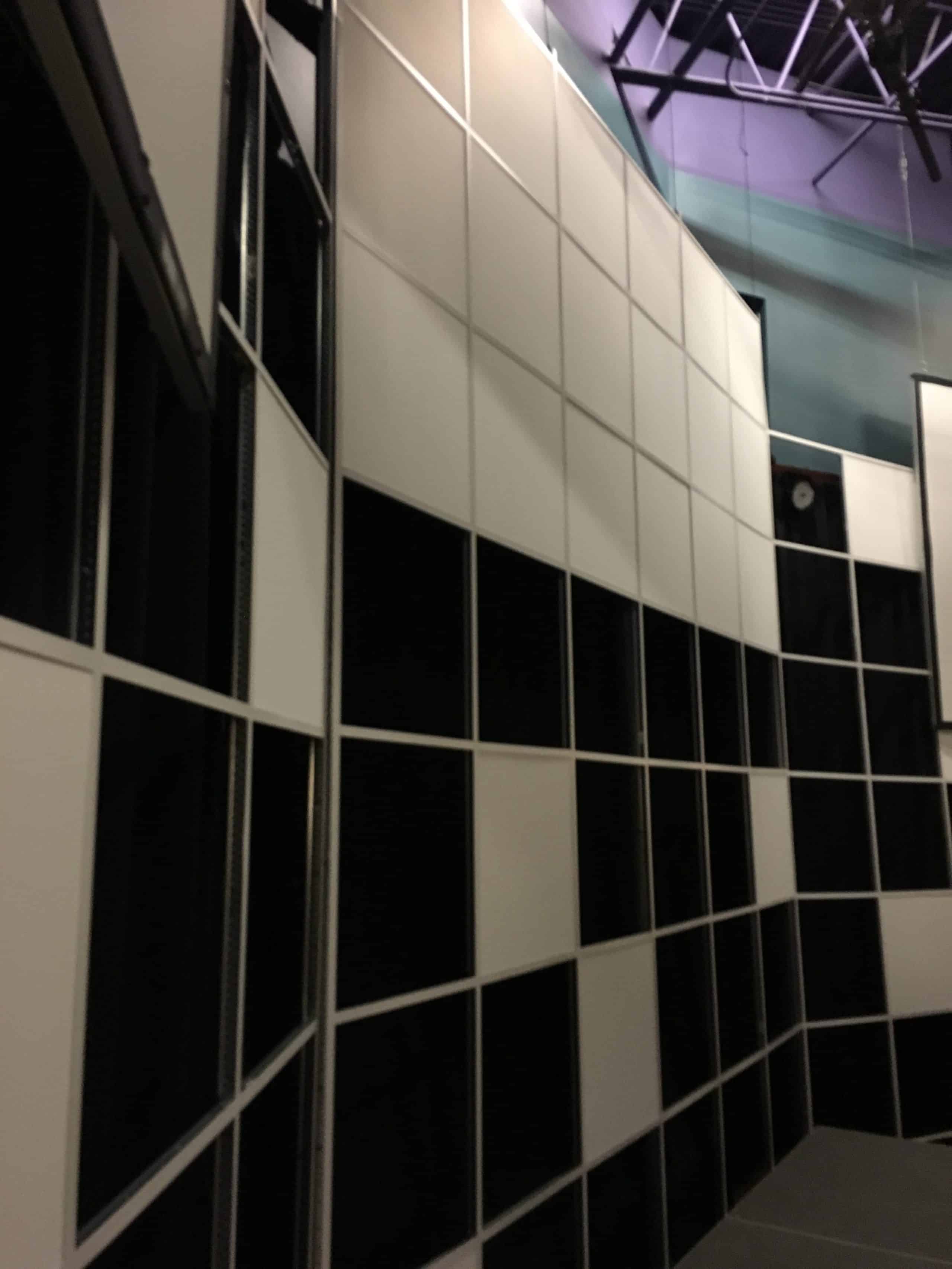We built the 4′ x 12′ and 4′ x 16′ ceiling grid sections on the ground, then raised them and put the connecting 4′ Tees and 2′ Tees in between those sections. The ceiling tiles were initially put into the grid on the ground of the first sections, but those proved pretty difficult to raise in place with all the weight at the top, so the rest of the tiles we put in while the structure fully assembled.