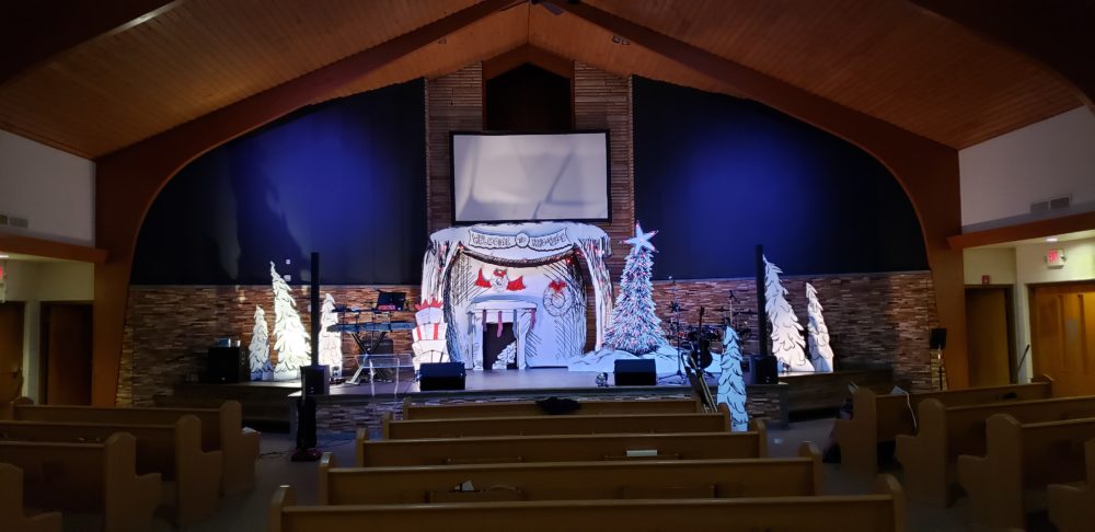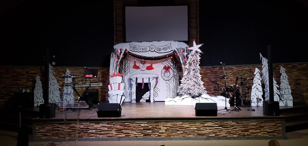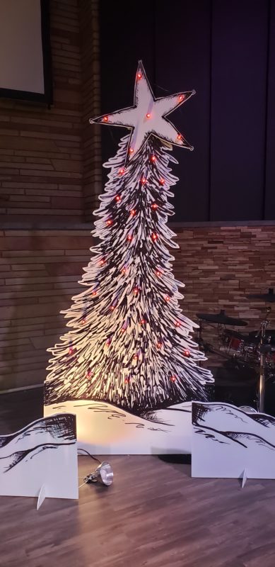 From Eric: Who Stole My Christmas? We got our inspiration from set designs from the Grinch Who Stole Christmas The Musical. We used 10 4’x8′ Coroplast boards, jumbo black markers and projected designs created by our design team onto the boards for tracing. We used 1″ PVC duct-taped to the panels to build the structure. If you don’t have a designer at your church, you can get a terrific design from www.fiverr.com. We used standard can lights for the up lighting and C9 bulb lights poking through the tree.