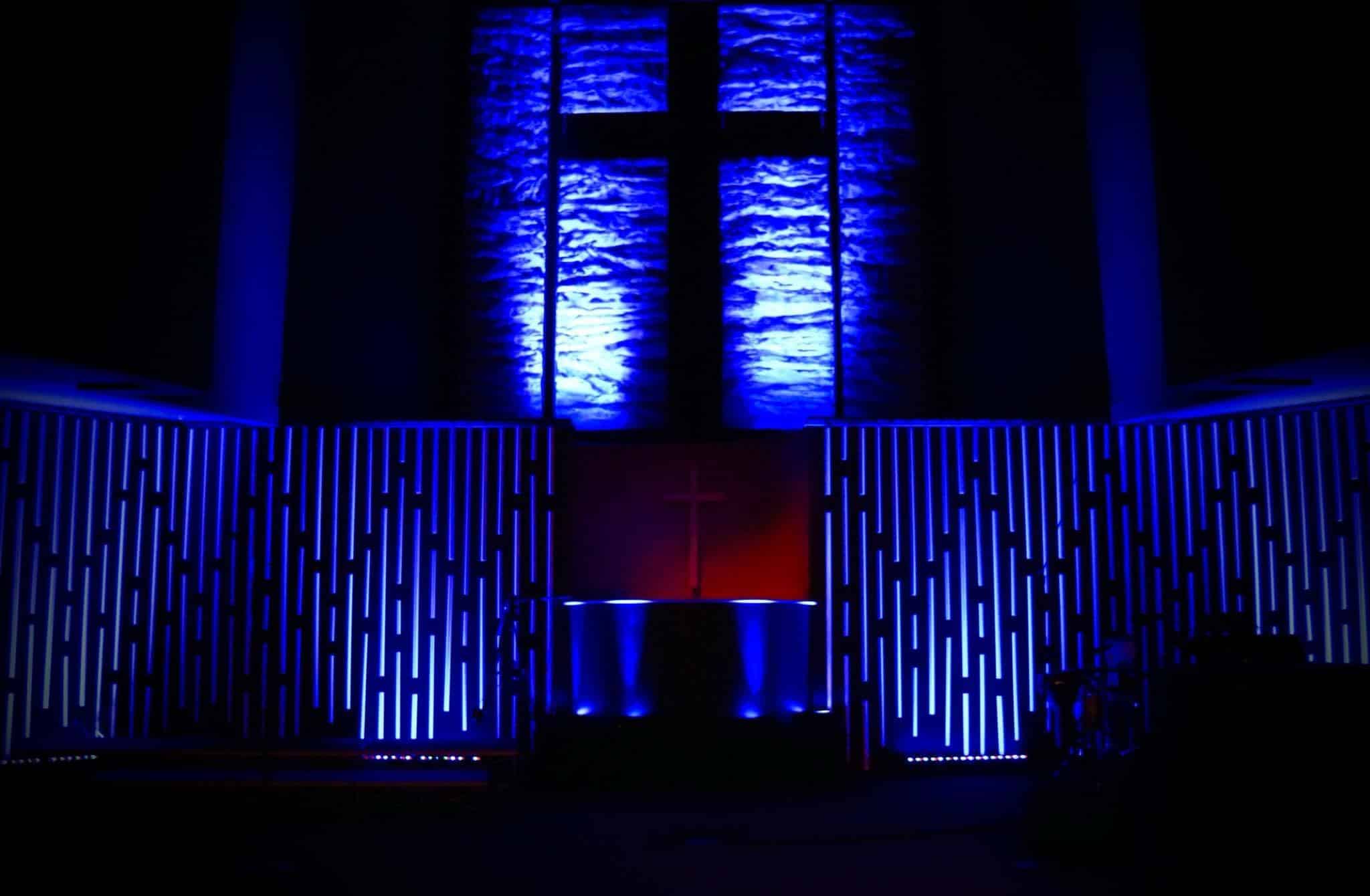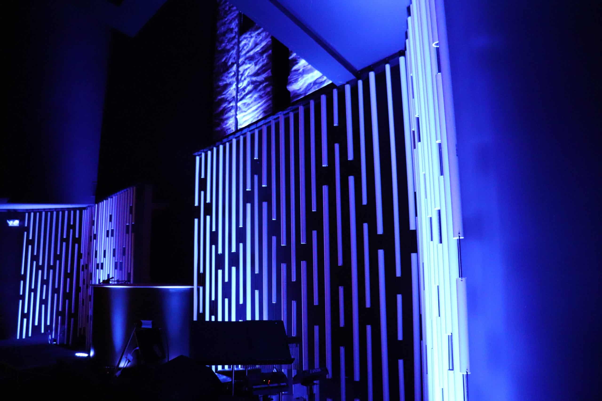 One of the greatest advantages of this design is its flexibility. You can vary the lengths of PVC sections to create visual interest, or keep them uniform for a more structured look. The spacing between pipes can be adjusted based on your stage width and the density of the visual effect you want to achieve. LED uplights positioned behind the pipes create dramatic silhouettes and color washes that transform the atmosphere for different service elements.