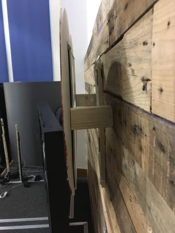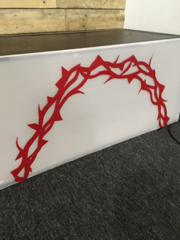 From Simon: For our Easter series, ‘Love’, we made a simple stage design using an MDF heart with the cross shape cut out. Coroplast was applied to the back. The heart was then mounted to our pallet wall. Behind the heart was a strip of white led tape. We then made a simple light box and used vinyl to make a crown of thorns on the front of the box. For lighting we had 2 home made led batons at either side, and two led bars which were placed on the floor which illuminated not only the pallet wall but the archway also. All we paid for was the MDF as the lights and Coroplast had been used in a previous design.