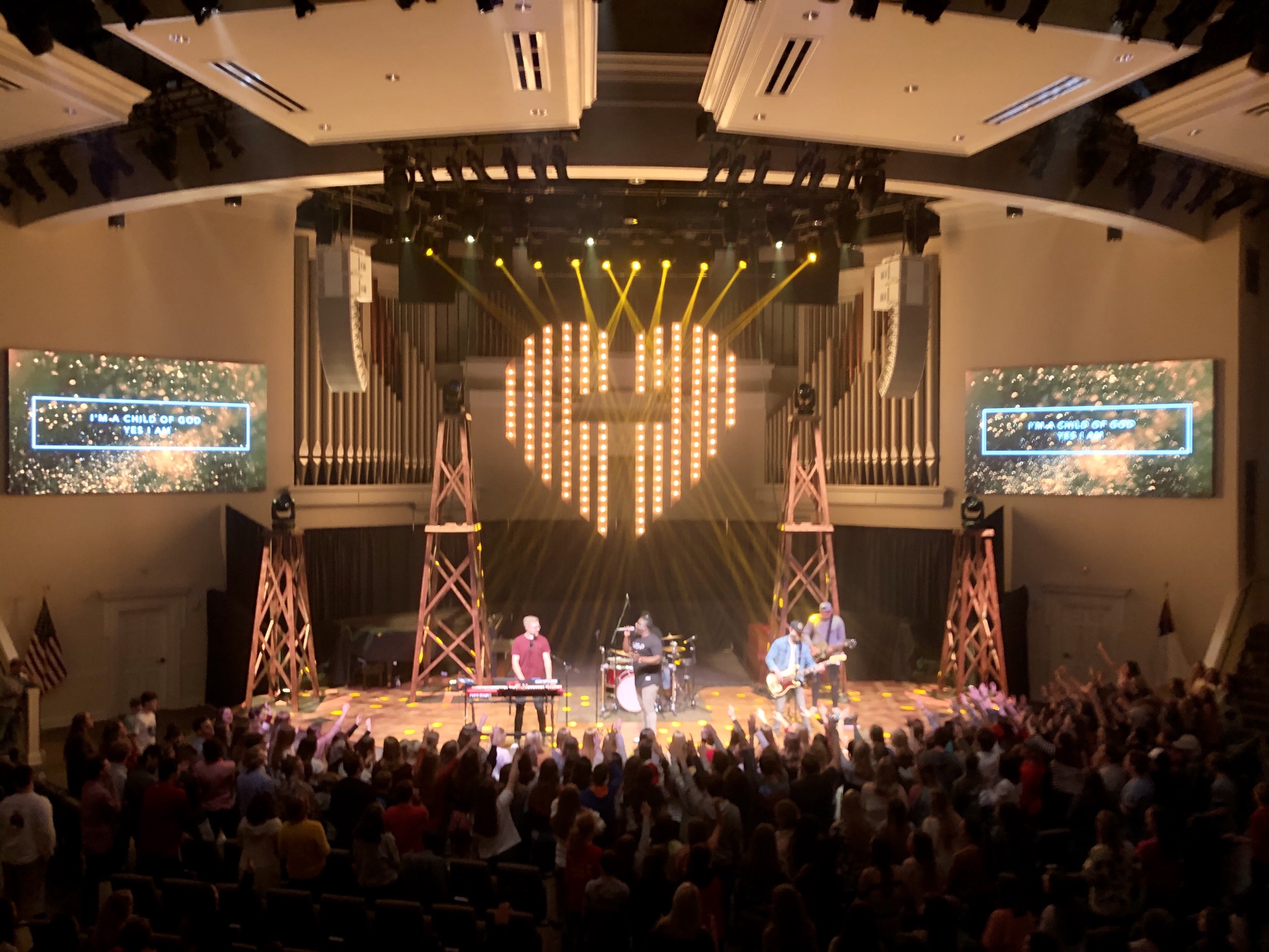 From the team: The theme for our DNow was undivided and the logo was a heart. We wanted to incorporate the logo into the stage design. So we scaled the heart up to the size we wanted in order to fill the stage, which ended up being about 14 feet tall. We used 1x8s.