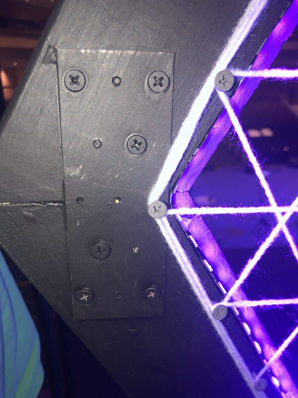 On the back of the shapes, we used short screws spaced evenly around the inside perimeter about 1/2” from the edge. Then, we stretched white yarn in different patterns from screw to screw. There was some trial and error.