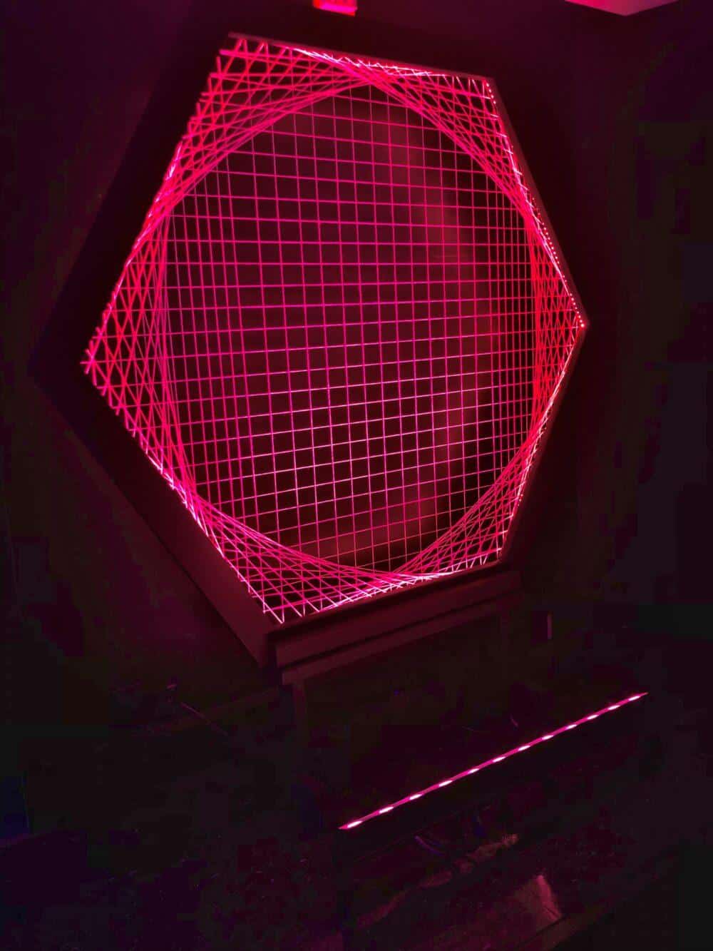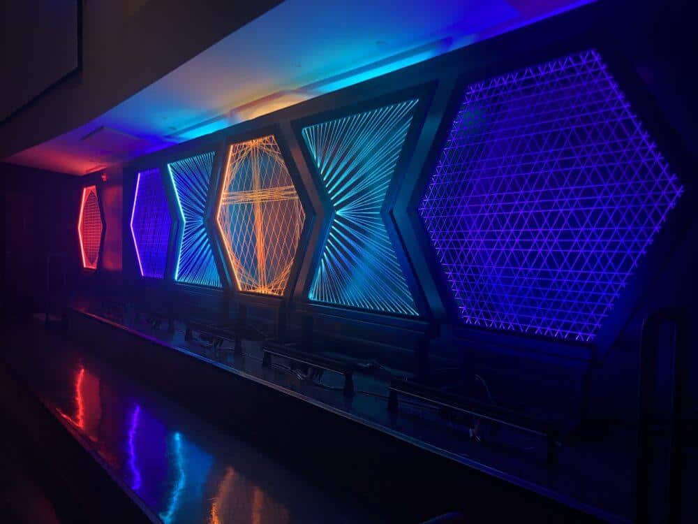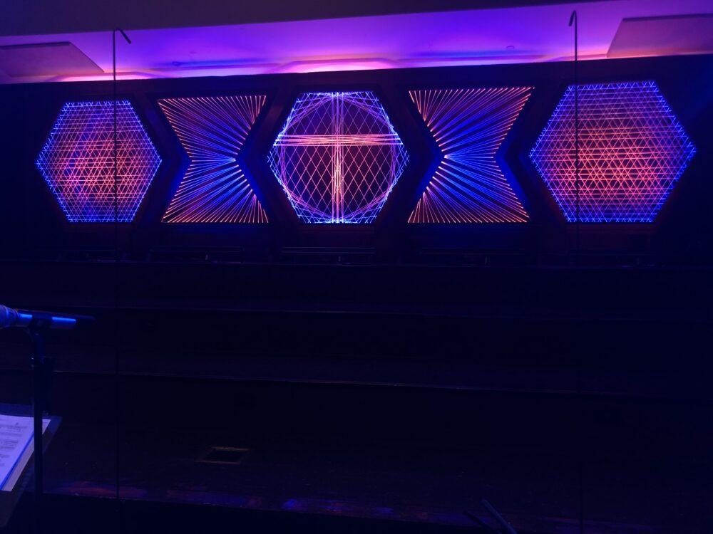 For this project, we built 5 6’ hexagons and 2 hourglass shapes that are the inverse of the hexagons. We used pine 2x4s, about 18’ per shape. The size of the shapes was determined by the length of the wall we have at 26’. Each corner of the shapes was glued, screwed, and braced with flat brackets. A 1/2” channel was routed on the back inside corner of each 2×4 so when assembled, there is space for the LED strip to be hidden. The shapes are placed in free-standing mounts for easy positioning. Everything was painted black. Chauvet battens are placed in front to get the two-color effect.