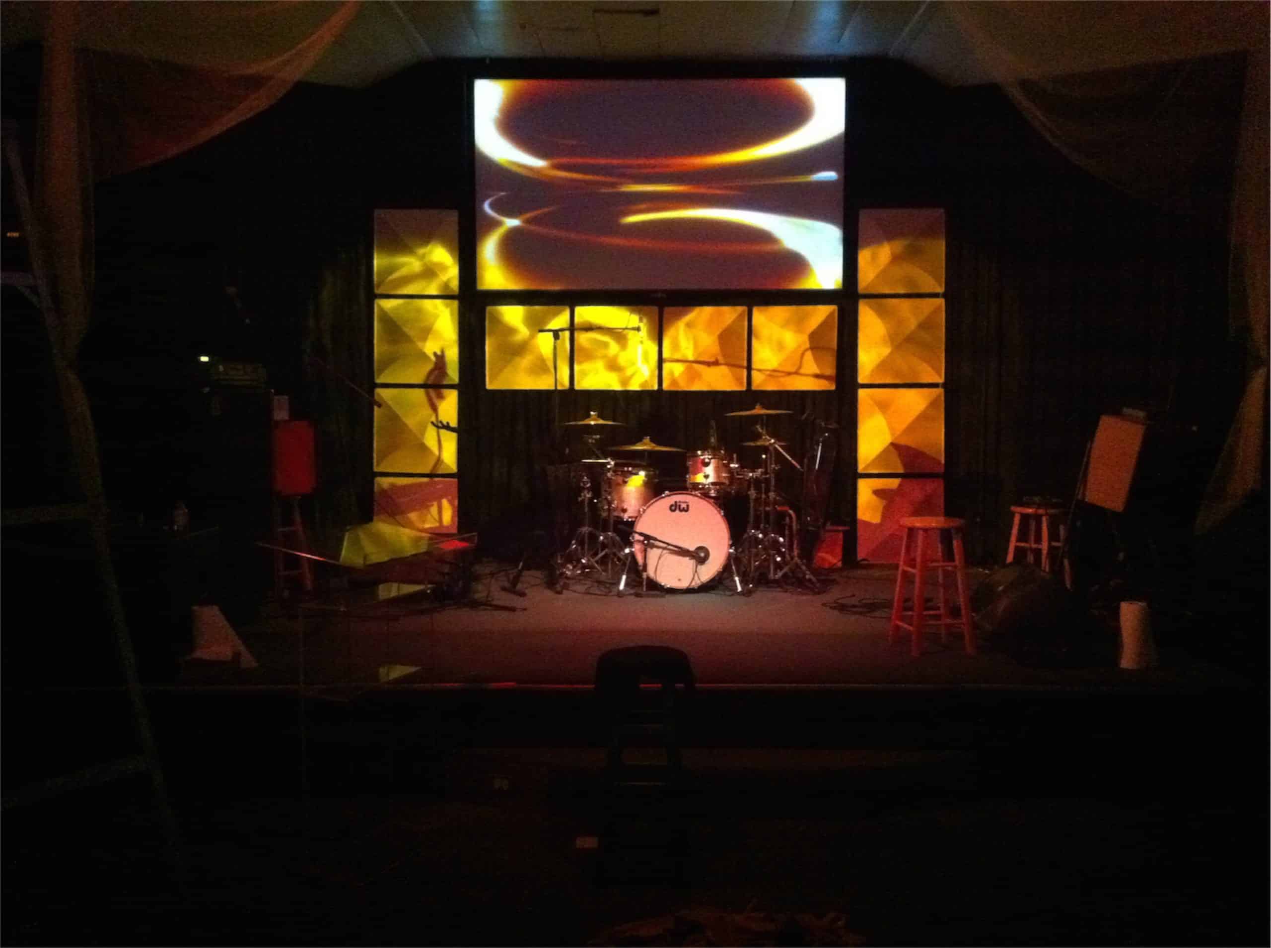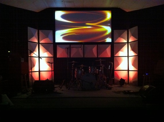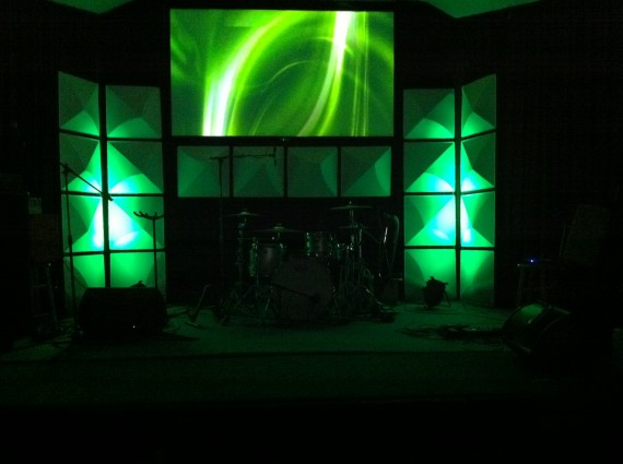 They have a small stage and an even smaller budget…but they wanted to change up the stage. So they bought some Mio Ceiling Tiles. They made frames out of (14) 2x2x8 pieces of wood to fit four panels each. He spray painted them black and stapled the panels to the front of the frames. The two side frames leaned against the wall, and the one across the drums was fastened with screws.