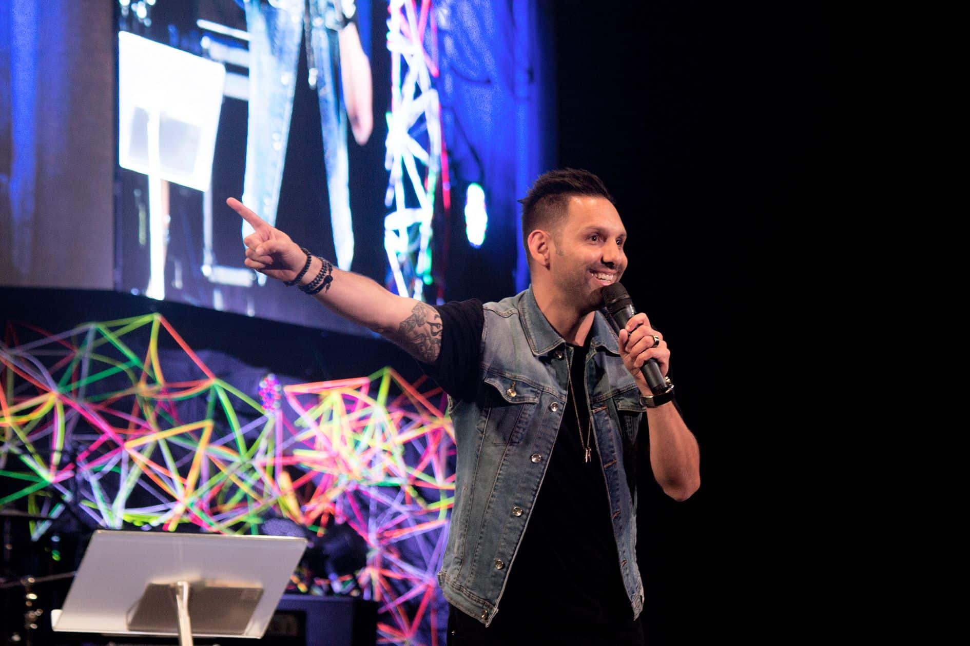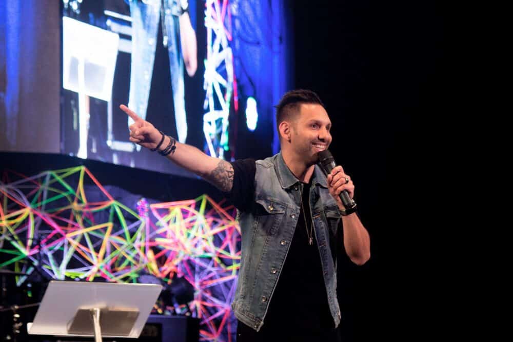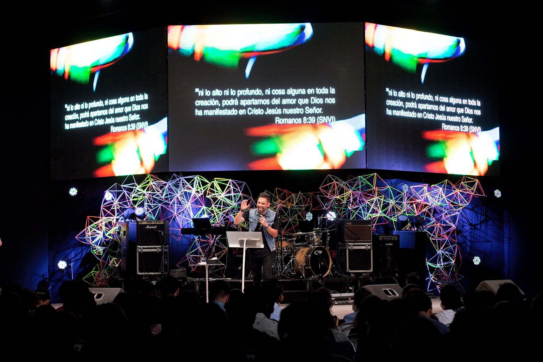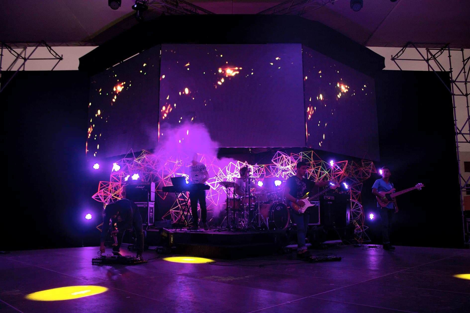 This stage was build for a youth event at the church. They chose to use white balloon rods that they painted with neon paint to create their effect. The construction process was to join the rods with fishing line, making several triangles and joining their vertices until they got the irregular shape they wanted.