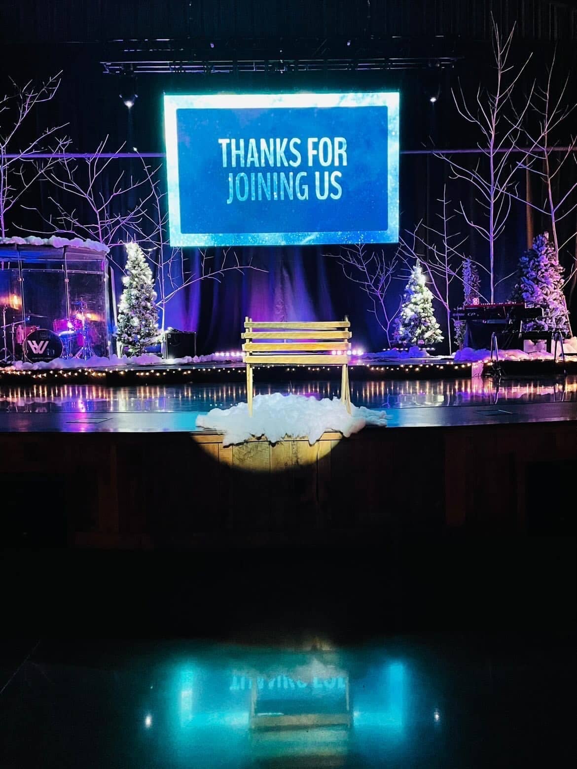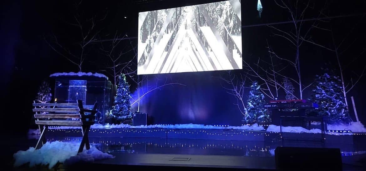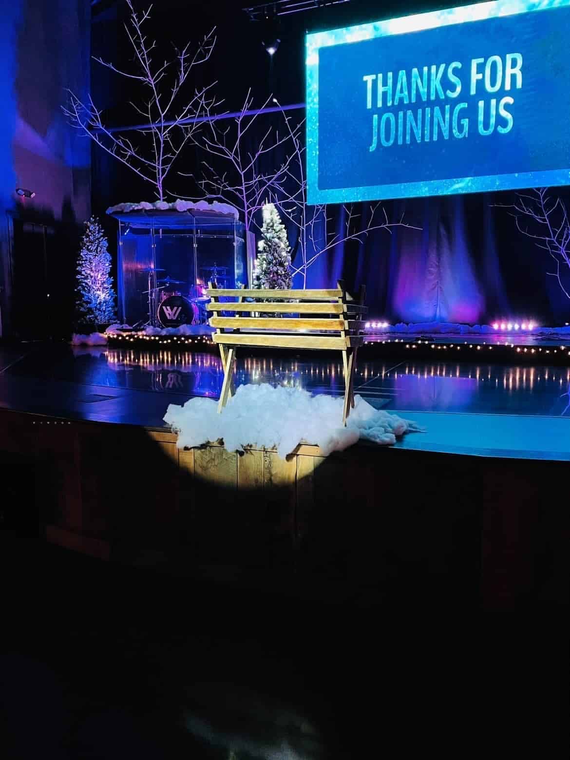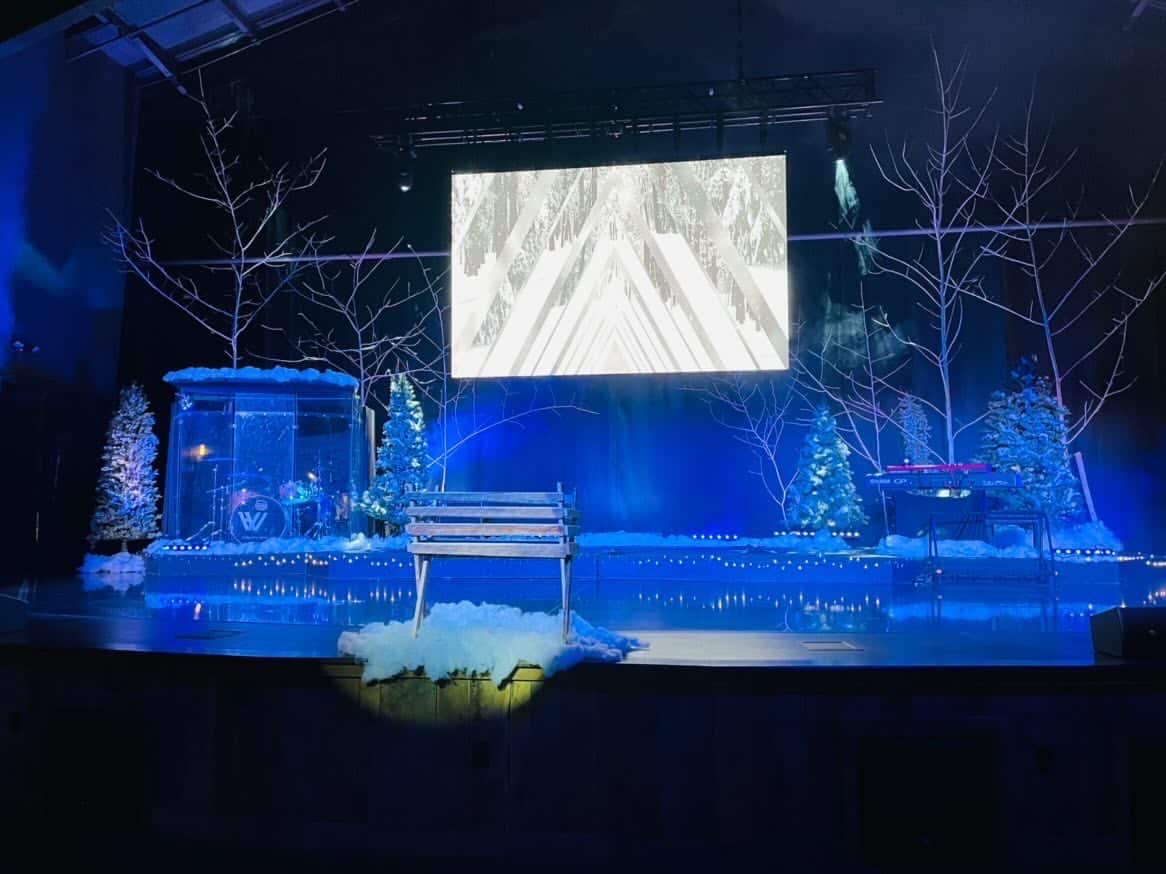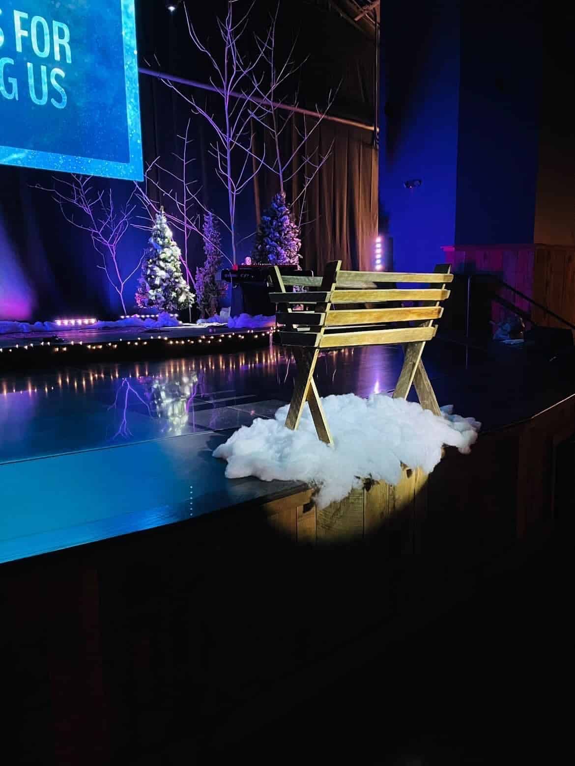 They cut down wispy trees and spray-painted them white. They had a few artificial Christmas trees that they “flocked.” Then they got the fake snow and laid it around the stage. Their December series was titled “Humble King” and they had a minimalistic manger built.