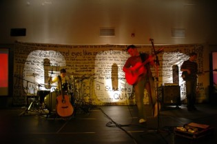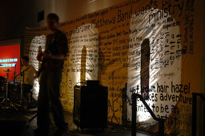 Check out this stage design on a budget for a ski trip. Walt Anderson and Steven Rinaldi put this backdrop together for their student ministries’ ski trip to Ridgecrest, NC. Their focus for the trip was being “hidden in God”. This simple idea literally only required fabric, paint, and several stage lights. They had the students and leaders write down their age and aspirations…then had their designers paint them on the fabric.