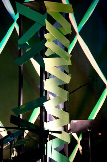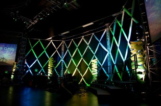 Glendale Matias, director of the visual arts ministry at Oasis Church in Los Angeles, California submitted this fresh and natural stage design. The Easter elements all revolved around green and grass.