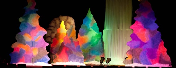 To create this set they used 4’x8′ styrofoam sheets. They first cut out the trees using an electric knife. They glued panels together using liquid nails to create sheets larger than 4’x8′. For extra reinforcement, they also glued long strips of styrofoam to the back to support the seams.