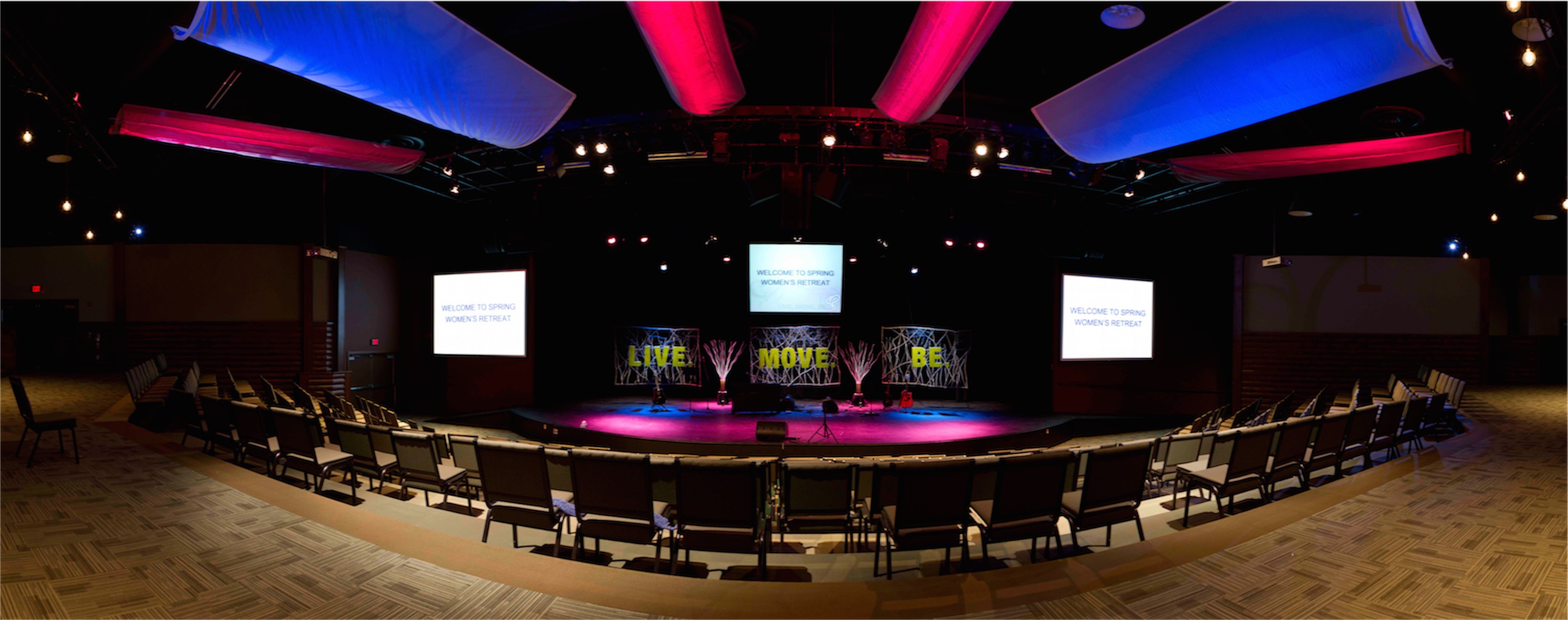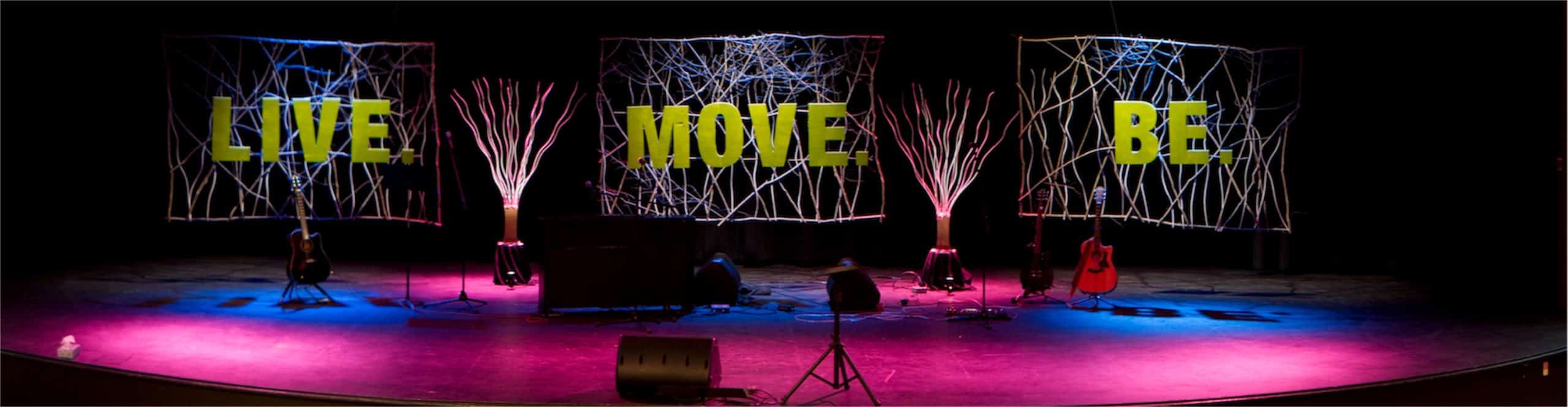 To create this intimate feel they constructed 3-6’x10′ flats constructed from branches found around the site as the primary structure. Interwoven into this framework were about 12 IKEA decorative sticks which were white in color. These really pulled out color from the lighting instruments. The flats were hung with tie lines. The words were constructed from foam board and hung approximately 15″ in front of the flats. They were connected to the flats with the same sticks used in the flats. Lighting was provided by ETC Instruments and the controller was a Jands Vista i3.