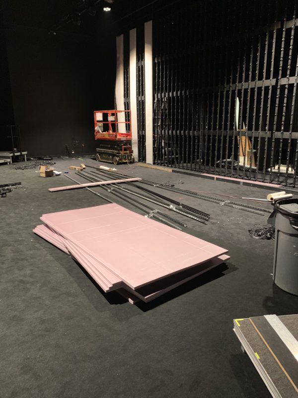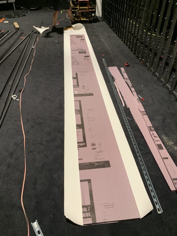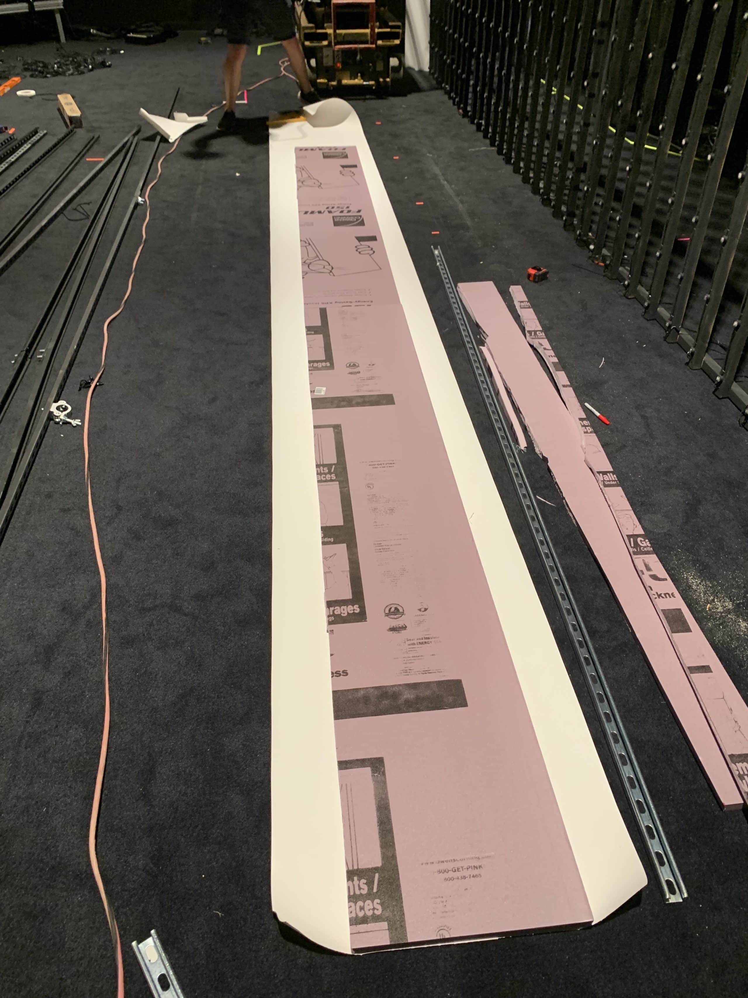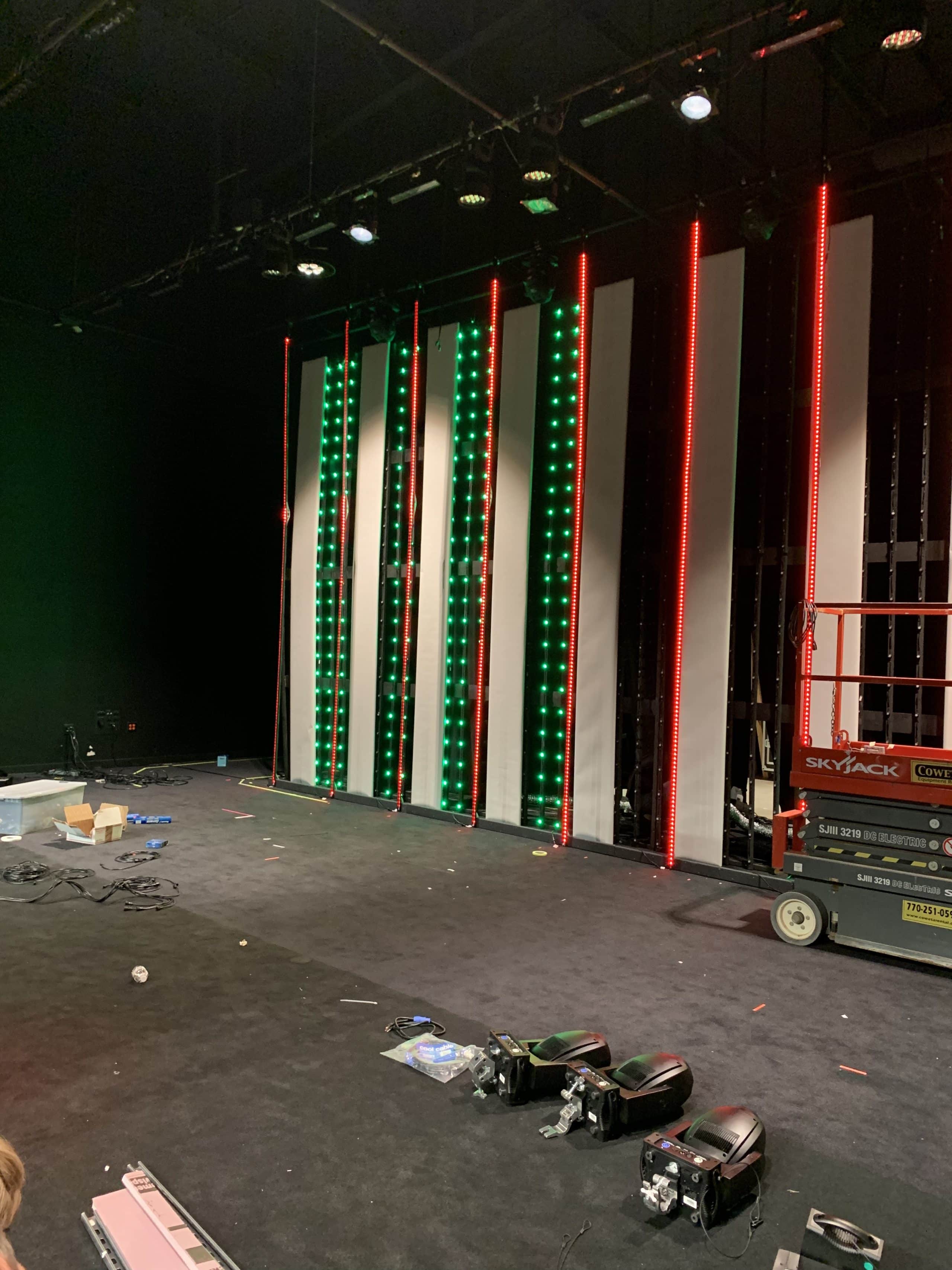 To create this, they bolted twenty 8 ft pieces of aluminum strut together to create ten vertical columns. They secured dumb LED strips to the back of each aluminum strut column. Then they added smart LED strips in the front of the channel and diffused them with wax paper. They created ten 16 ft columns out of styrofoam board (from Home Depot) wrapped in photo backdrop paper.