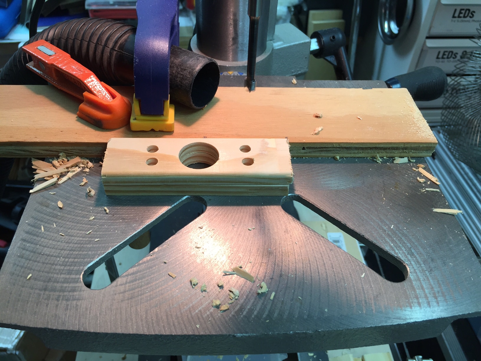 – once I had the china ball lights, including the internal wire frames, I had to design a way to mount the LED to the wire frame. I quickly came up with an idea of using some wood trim, with a few holes in it, which would both attach to the wire frame, as well as allow the attachment of the pixel board. I just used wood door trim from my local hardware store. I was able to get 20 pieces out of a single length of trim. I then set up a jig on my drill press, with measurements, and then drilled the large hole using a forstner bit, for a clean hole. I would not recommend any other bit, given the size of the hole in comparison to the size of the wood trim — the wood would be destroyed by something like a spade bit. Tip: put a piece of wood under the piece you’re drilling, for a cleaner hole on the bottom of the piece.
