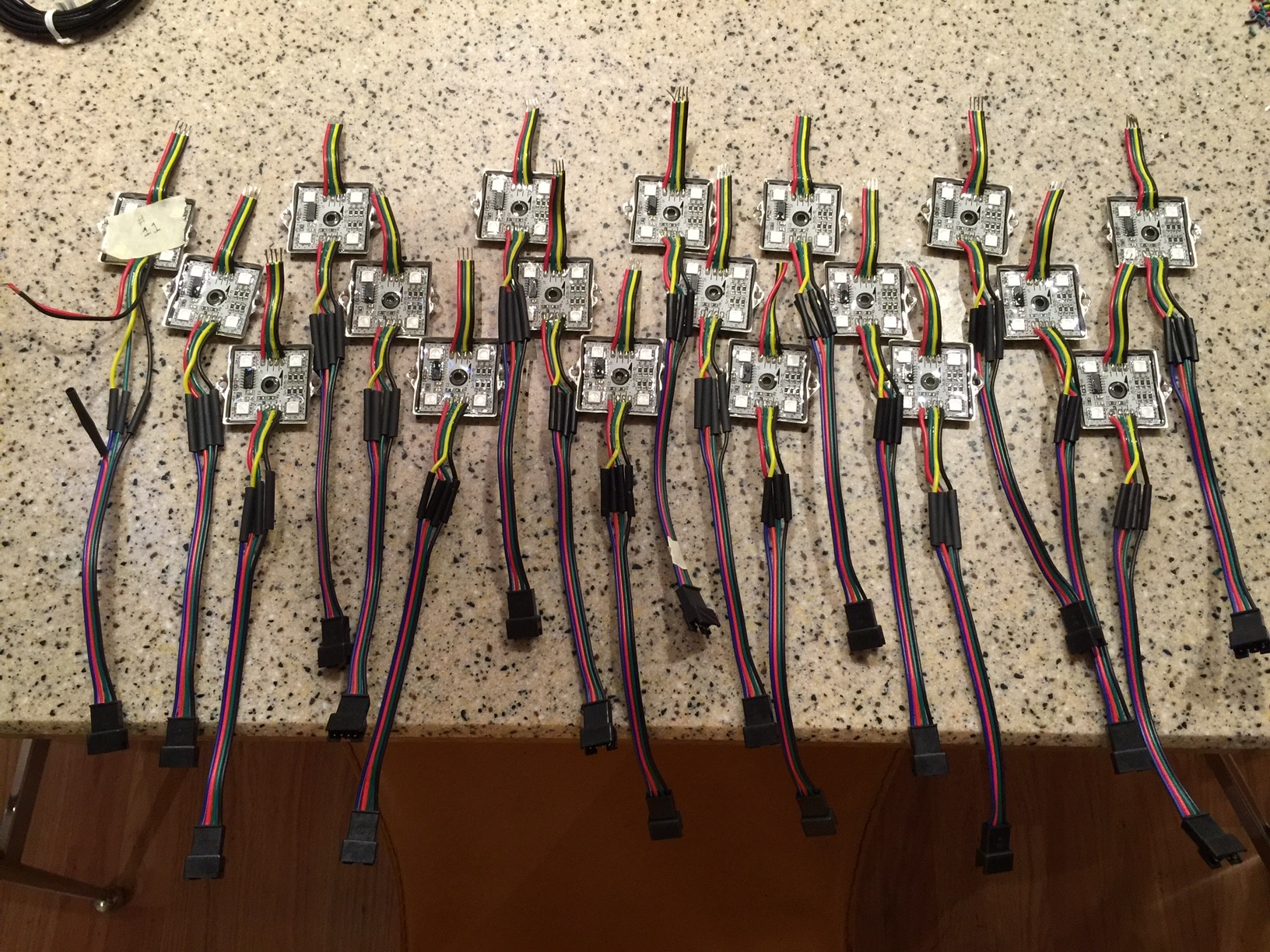 – I used the measurements from the planning phase to create patch cables as described above. I used the same process and connectors as were used for the pixels, and made 16 of these patch cables.