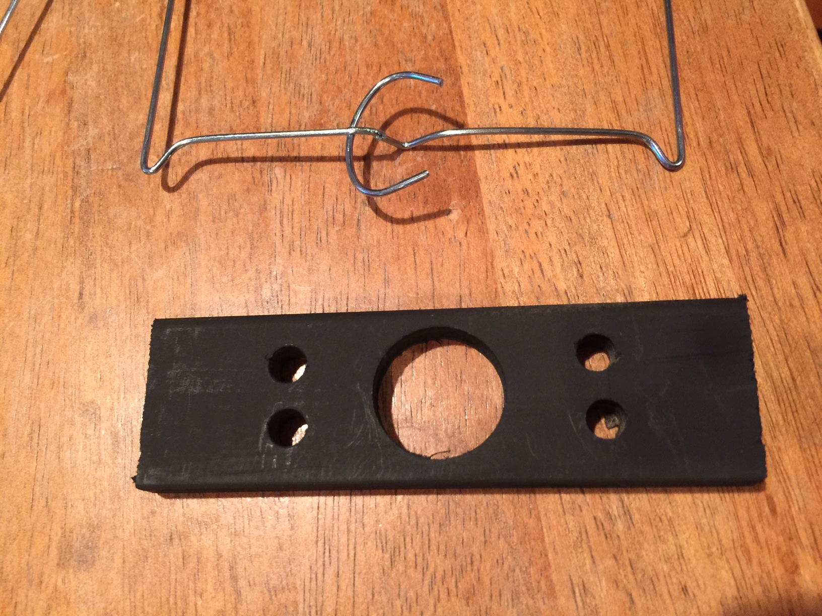 – finally, I attached the wood/pixel combo to the wire frame of the light. It goes on nicely with wire ties. The bottom hook part of the wire frame protrudes nicely down through the large hole in the wood trim piece. Note that I attached the wood trim piece *under* the wire frame, so that the pixel board is pointing straight down into the light.