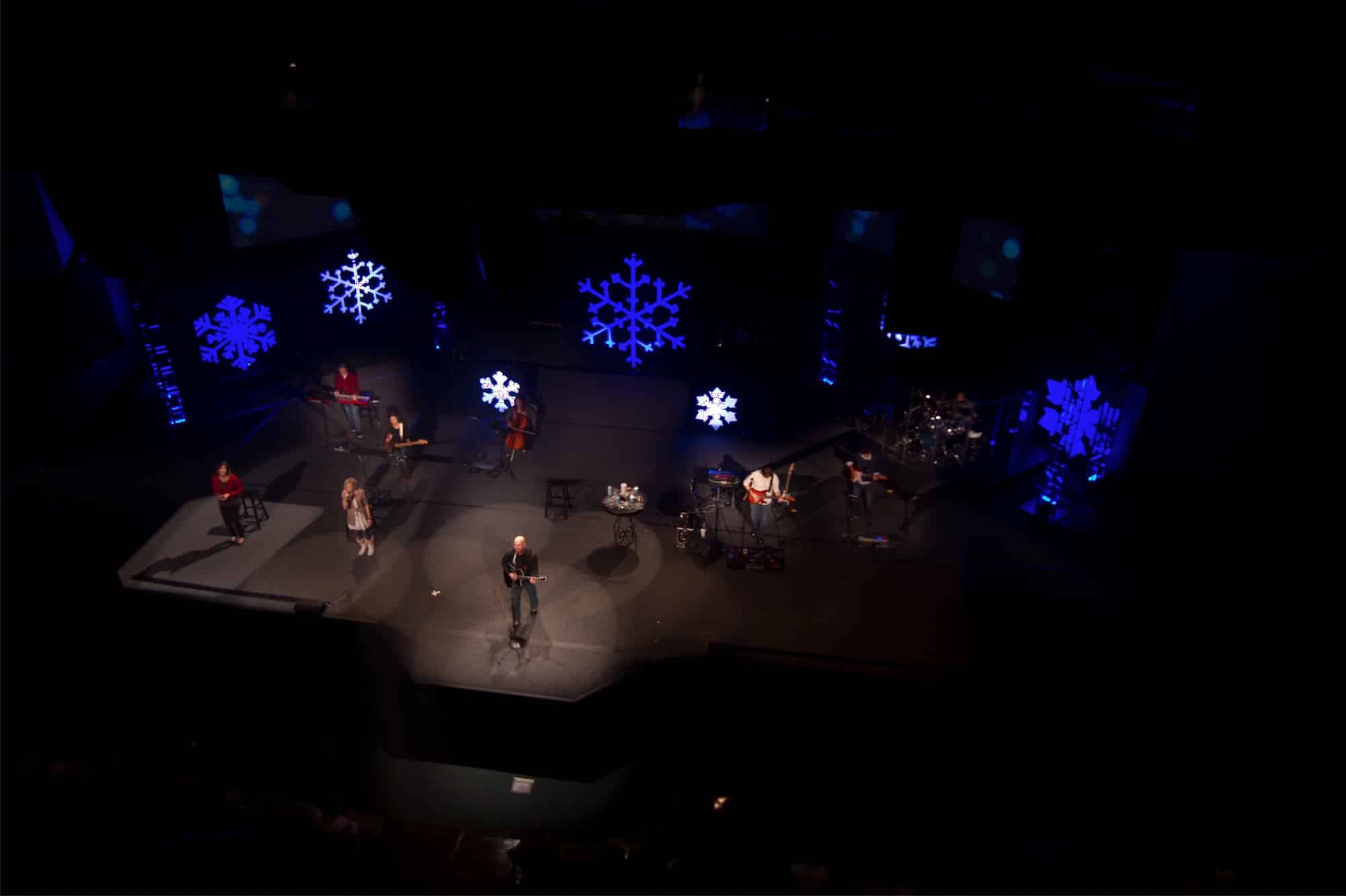 They put one Color Kinetics Color Blaster in each light box. The different sizes of the snowflakes were: one 12’x12′; four 8’x8′; four 4’x4′ boxes. They hung strand LED lighting from IKEA on the side walls and did an overall wash with Color Blasters.