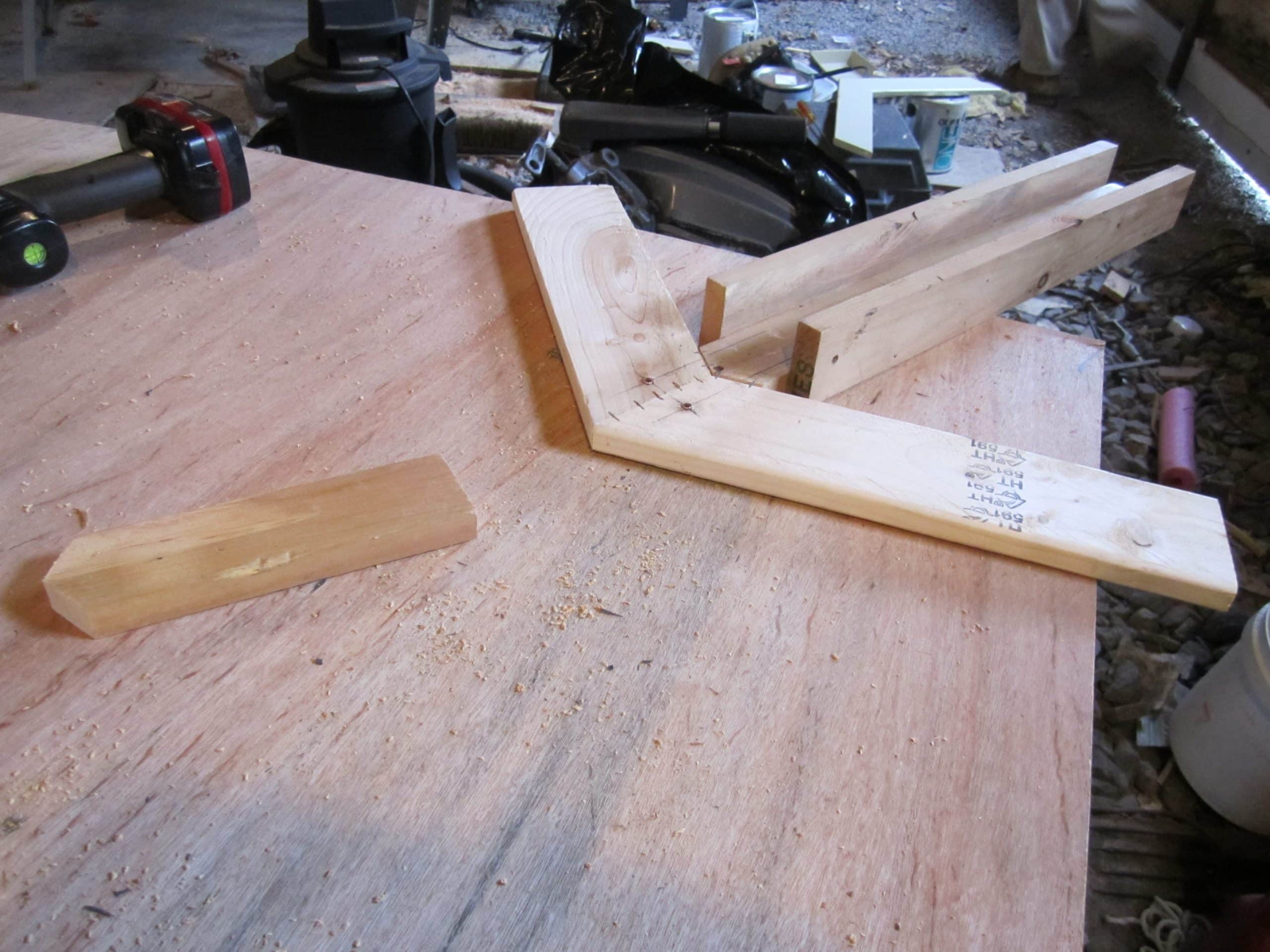 They made a template to assemble and space each chevron evenly on the upright. Chevrons were made from 1″ x 4″ softwood cut at a 30-degree angle. The total width of the Chevron was 32 inches wide. The bottom of the upright had a footer to keep it square to the wall to prevent twisting. The edges were sanded to give them a softer appearance. Then they were painted with two coats of latex paint. They saved money by purchasing paint from the clearance shelf.