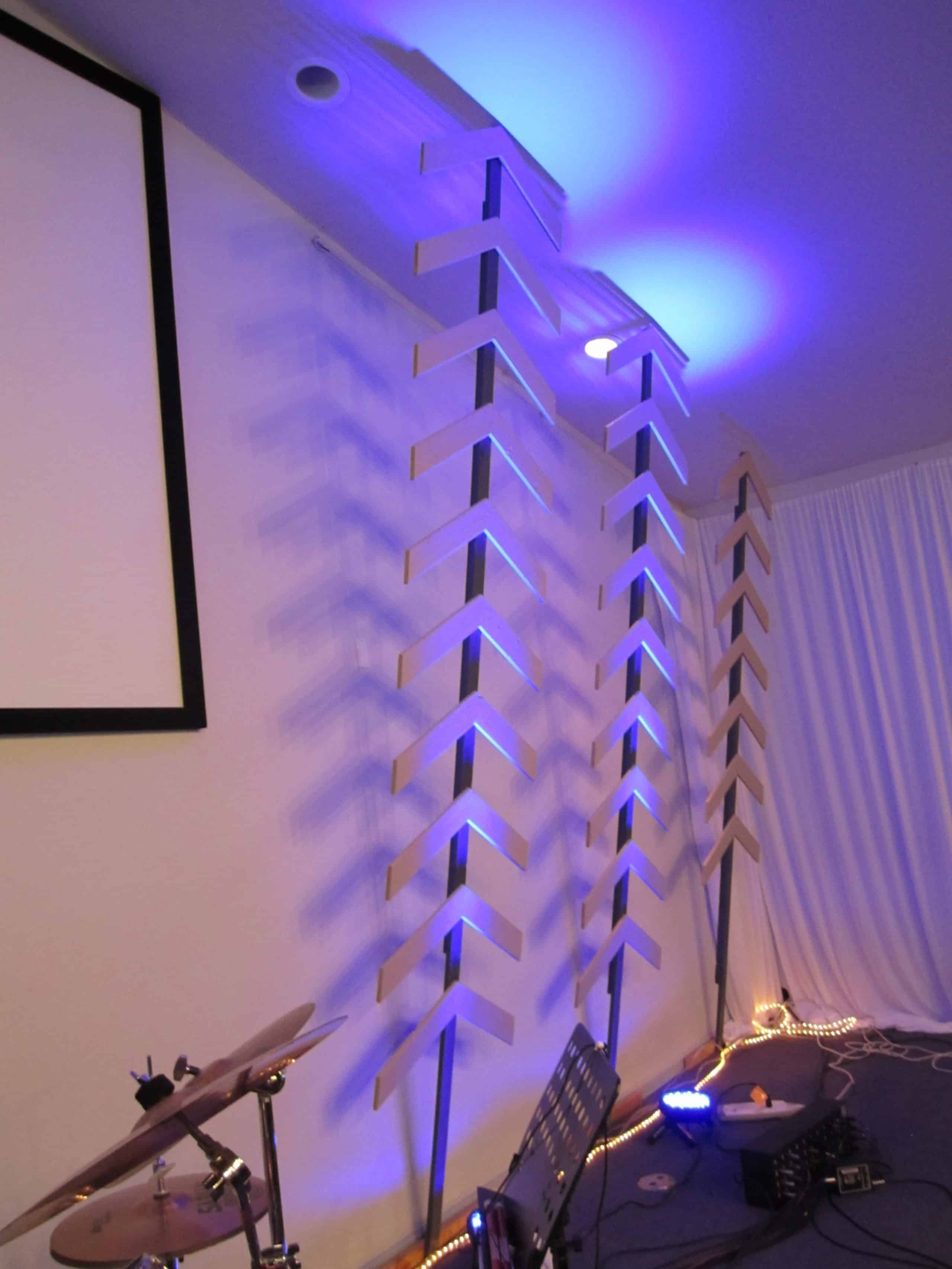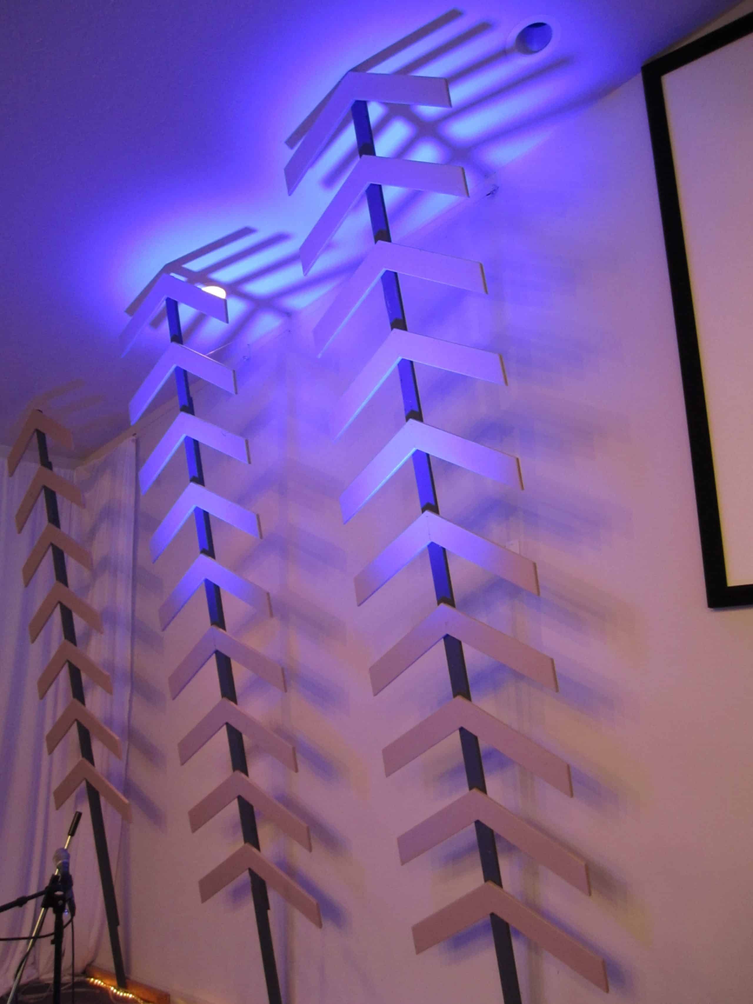 The entire structure cost $70 (not including lights). Construction took approximately 10 hours and the install took 2 hours with 2 people. Lighting was with can lights from the floor. Rope lights on the floor gave extra illumination. Also they experimented by moving the lighting in between the chevrons for a different look.