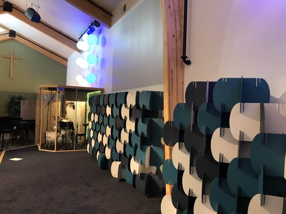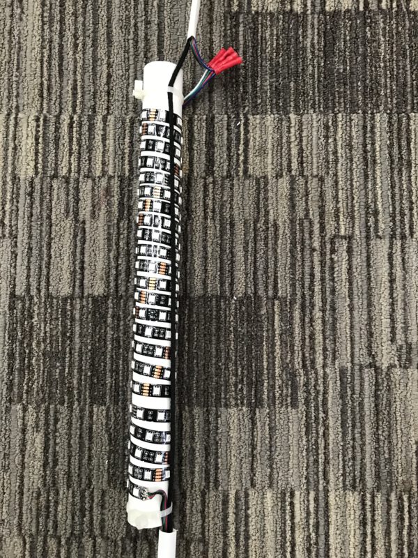 From Ryan: For this design I used paper lanterns we got from amazon and used led tape wrapped around 1″ PVC pipes to light them from the inside. The led tape runs to dmx decoders and power supplies I mounted to the ceiling pipe that we already had as part of our lighting system. I zip tied the PVC pipes onto tie line and tied them up to our ceiling pipe. With this design each line can be individually controlled via two 12 ch dmx decoders which allows us do chases or other lighting effects. We used 16″ lanterns and offset them to make a cool wave design. We wrapped 1/2 of a 5 meter Supernight LED tape from Amazon around a 1″ PVC pipe about 15″ long. After we hung the PVC pipes we assembled the lanterns and slid them over top. We spent total on the lanterns, led tape, power supplies, dmx decoders, and PVC pipe, extra wire, about $450 for the 12 lanterns. This design could be easily modified with larger lanterns or more channels of control for more effects. On the bottom we just just used Nomad room dividers from mioculture.com in a random pattern.