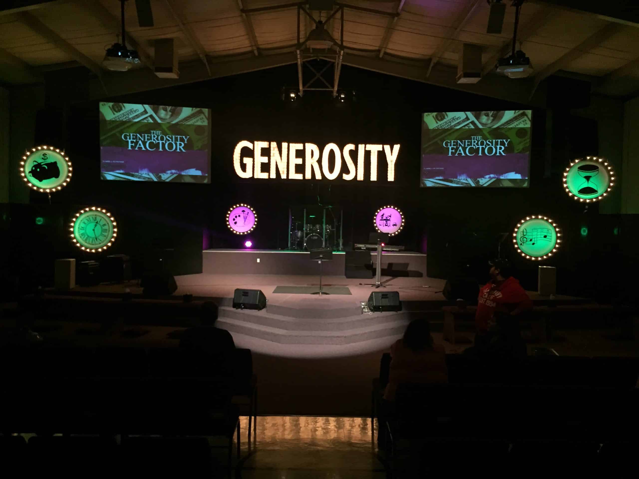 They hung the sign “generosity” on a semi-circle curve to give the stage even more dimension. And instead of large 40w lights, they repurposed clear C9 bulbs from their Christmas set. Next, they cut six 4′ circles out of OSB bored. They drilled a hole every 15 degrees, stretched white sheet, and stapled it down. Then they free handed the pictures and painted it. All together they used 650 C9 lights. They spent about $500 in all material and rigging. But 20 strands of lights where repurposed.