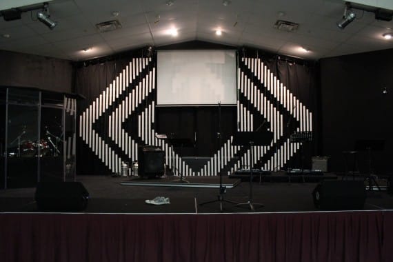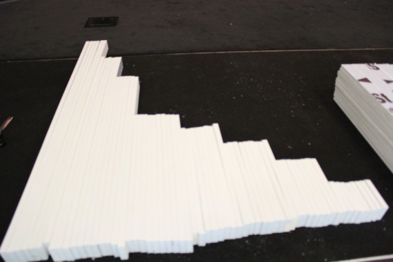 Then they laid out the design on stage. The spacing between each of the strips was 2 inches, and then each strip was 4 inches above the previous to get the angle.