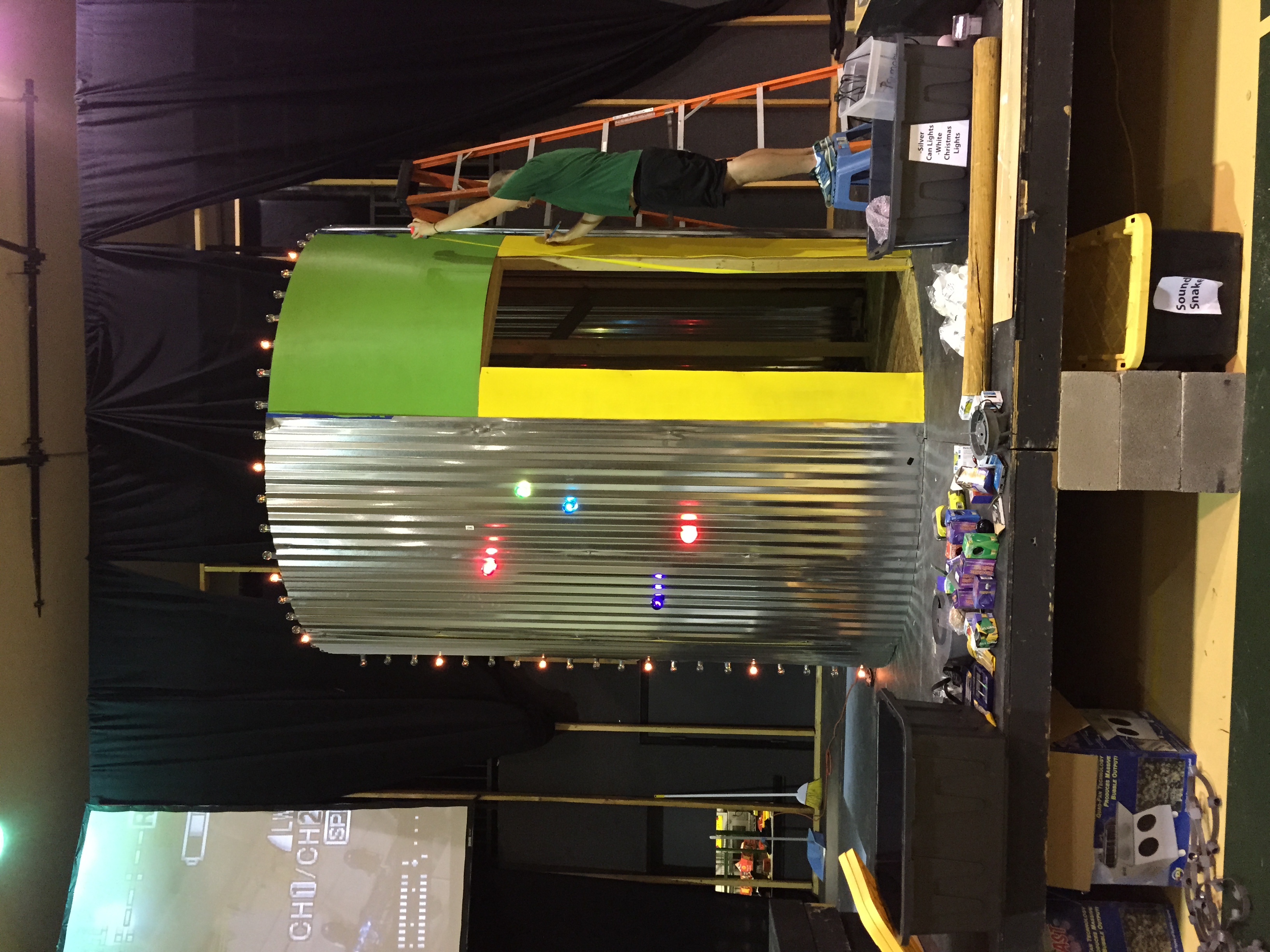 This year’s theme was based off of a “Mad Scientist” concept which stretched Jon’s imagination. They built this in under 2 weeks and nothing was rented for this set. They made it all, with the exception of the barrels. Their stage was constructed of 4×8 panels on cinder blocks.