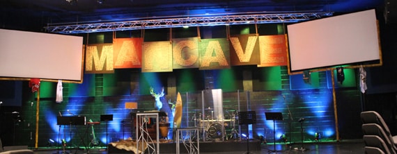 This set was centered around the letters spelling mancave. They made the letters from 1/2” plywood cut into 4×4 pieces and painted various earth tones to give the stage some manly color. They used a transparency paper and a projector to trace the words on the wood. Then they nailed several nails about 2-3 inches apart along the outline. Then they wrapped string around the entire letter 3 times. Once the outline were there they filled in the letters with string.
