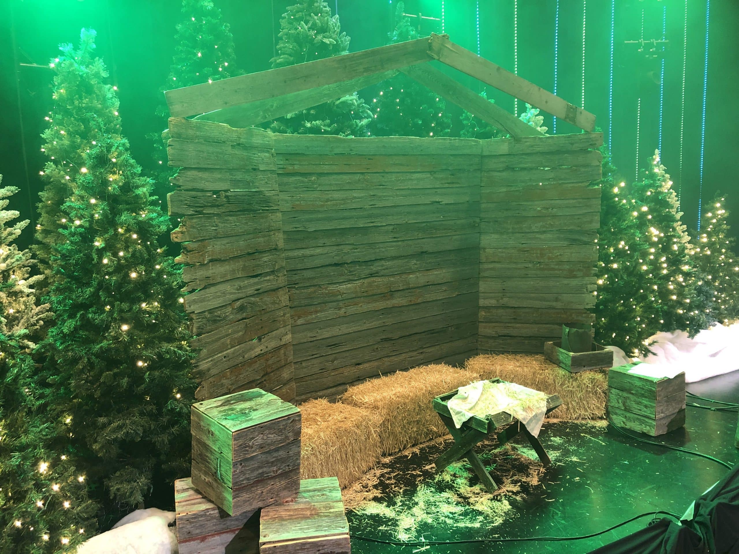They wanted to go with a traditional and warm look for their Christmas season so they put it out to the church congregation to ask for used artificial trees to donate. A volunteer made up a simple three-walled stable and a manger and some boxes out of old barn board.