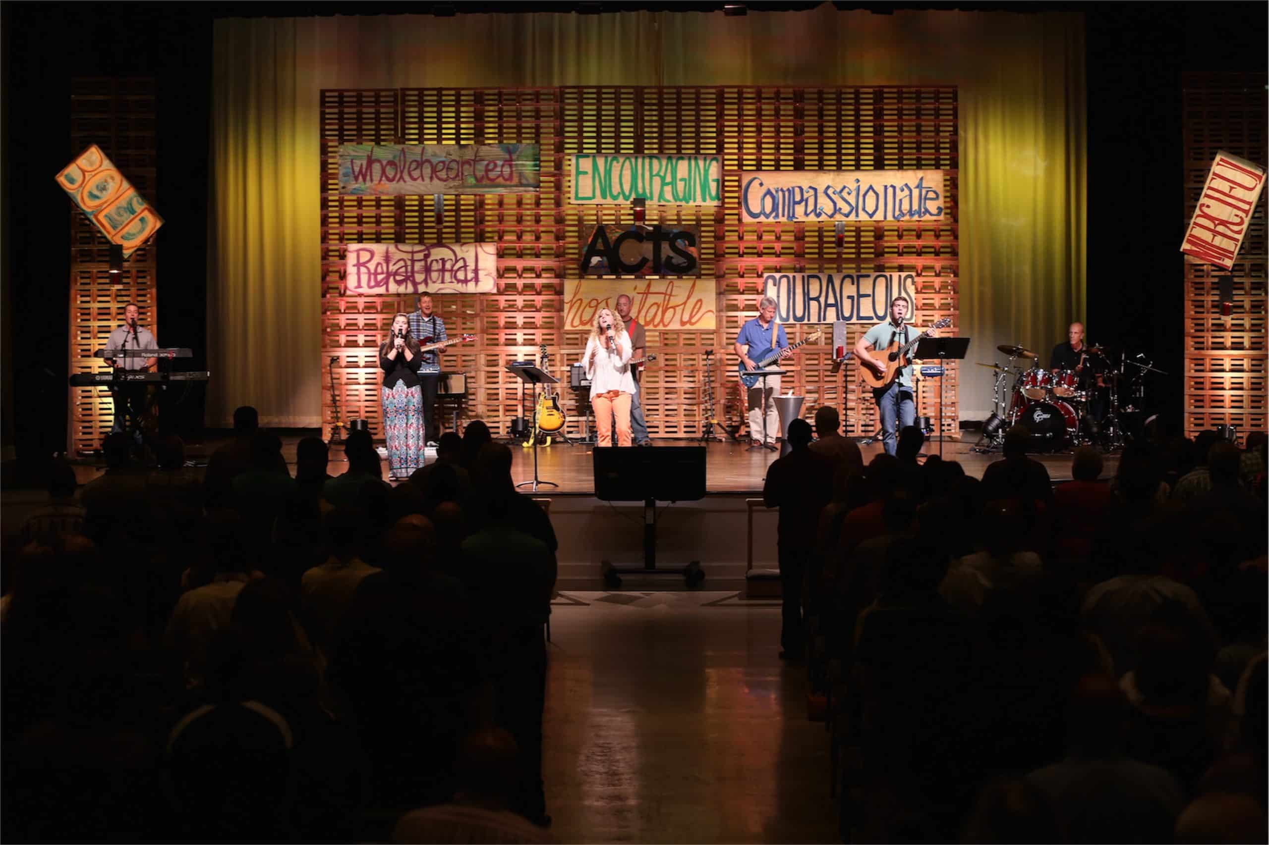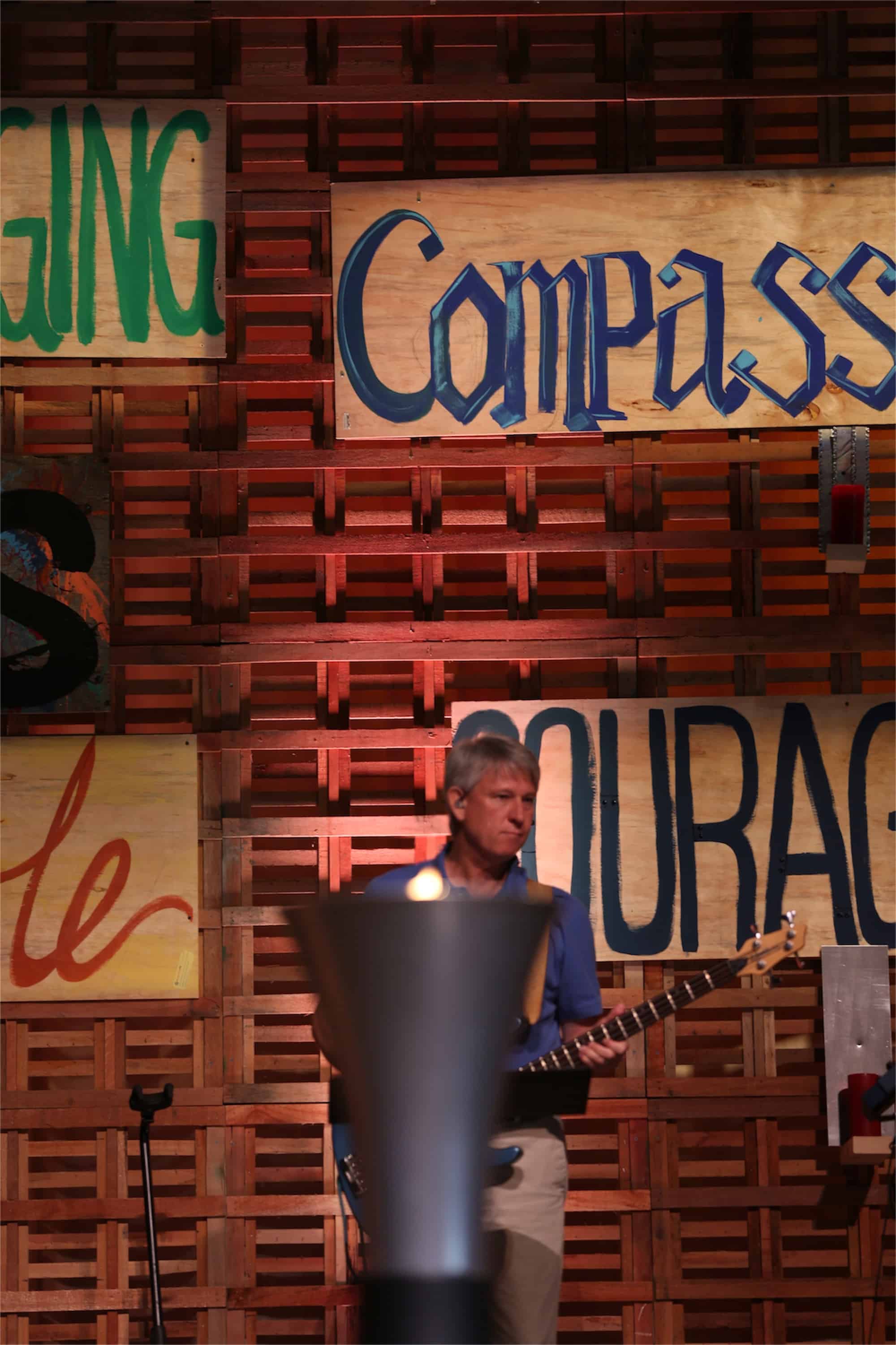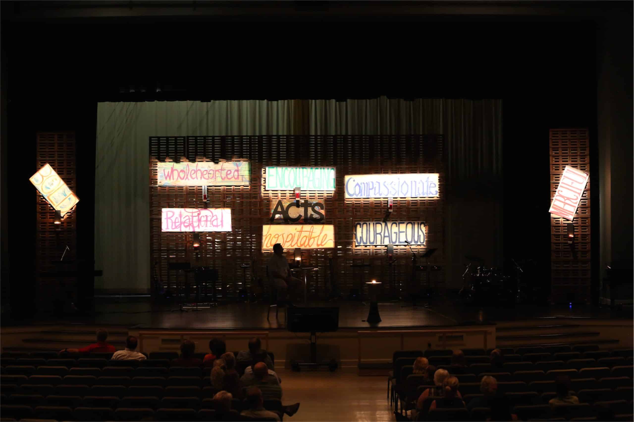 Then, to bring focus to the highlighted spiritual gifts from their series, Alex painted a sign for each adjective and added a new word to the wall every week. The signs were painted on ¼ inch plywood. With Acts 2 in mind, they also wanted a way to express how the Holy Spirit came like a fire to rest on the people, fill and enable them. So, they put an “eternal flame” fire pit center stage and a candle under each word on the wall. So, that in accordance with the message each gift (candle) was empowered (lit) by the flame of the Holy Spirit. They spent under $500 on the entire set for a 9-week series.