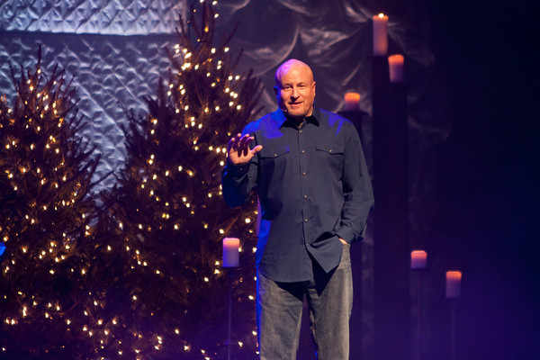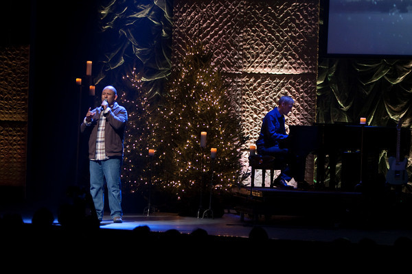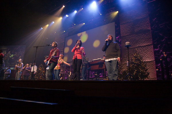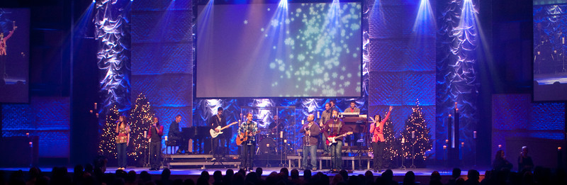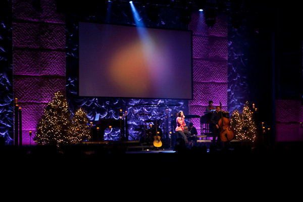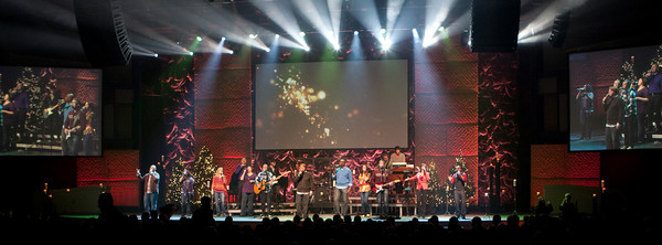 The backdrop was a 50X24 laser cloth they rented from Atomic Design. They built the columns out of 4×4 frames covered with luan, batting, and fabric then hung them from a truss and screwed them together to form the columns. The backdrop was lit with PixelLine 110’s and Robe color wash 575’s. They also had 5 Christmas trees and a ton of candles on stage.